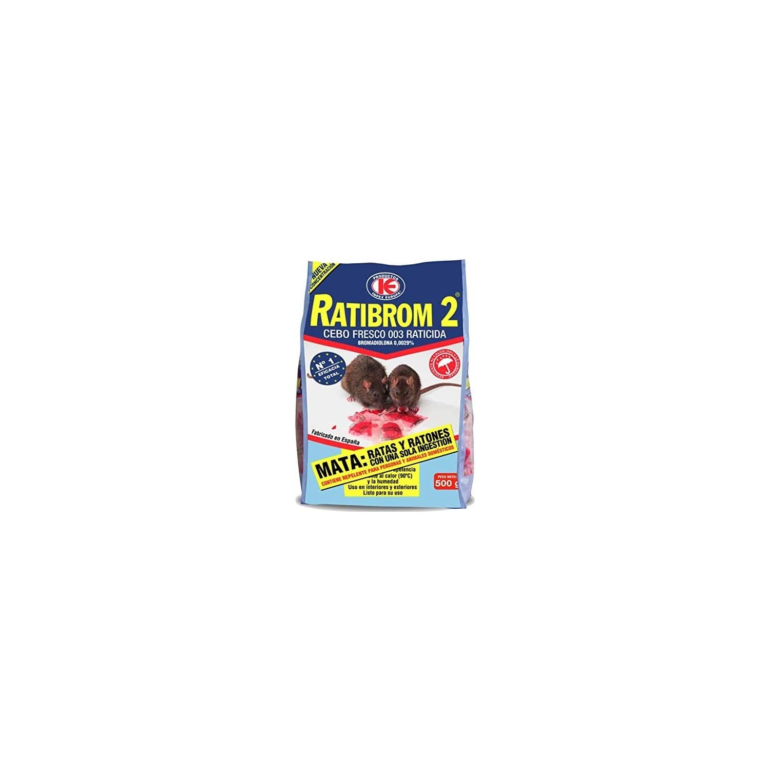 Ratibrom 2 es un rodenticida anticoagulante eficaz para el control de ratas y ratones tanto juveniles como adultos, Se debe evitar su utilización en aquellas áreas donde existan indicios de resistencia al ingrediente activo, Con el objetivo de prevenir el desarrollo y diseminación de resistencias, se debe asegurar la susceptibilidad de los roedores a la bromadiolona antes de comenzar el tratamiento, Después de la campaña de control se debe comprobar que se ha alcanzado los objetivos previstos, Veneno resistente al calor y la humedad. MODO DE APLICACIÓN: Se localizará únicamente en el interior de viviendas de uso privado, en portacebos correctamente etiquetados. Colocar las bolsitas, sin abrir, en el interior de los portacebos correctamente etiquetados, y situarlos donde existan señales de actividad de los roedores tales como excrementos frescos, en el interior de madrigueras, lugares de paso o lugares de acceso a alimentos. DOSIS DE APLICACIÓN: Ratones: Portacebos con 50g de producto cada 5 - 10 m2. Ratas: Portacebos con 100g de producto cada 5 -10 m2. COMPOSICIÓN: Bromadiolona 0,0029% y Excipientes c,s,p, 100%