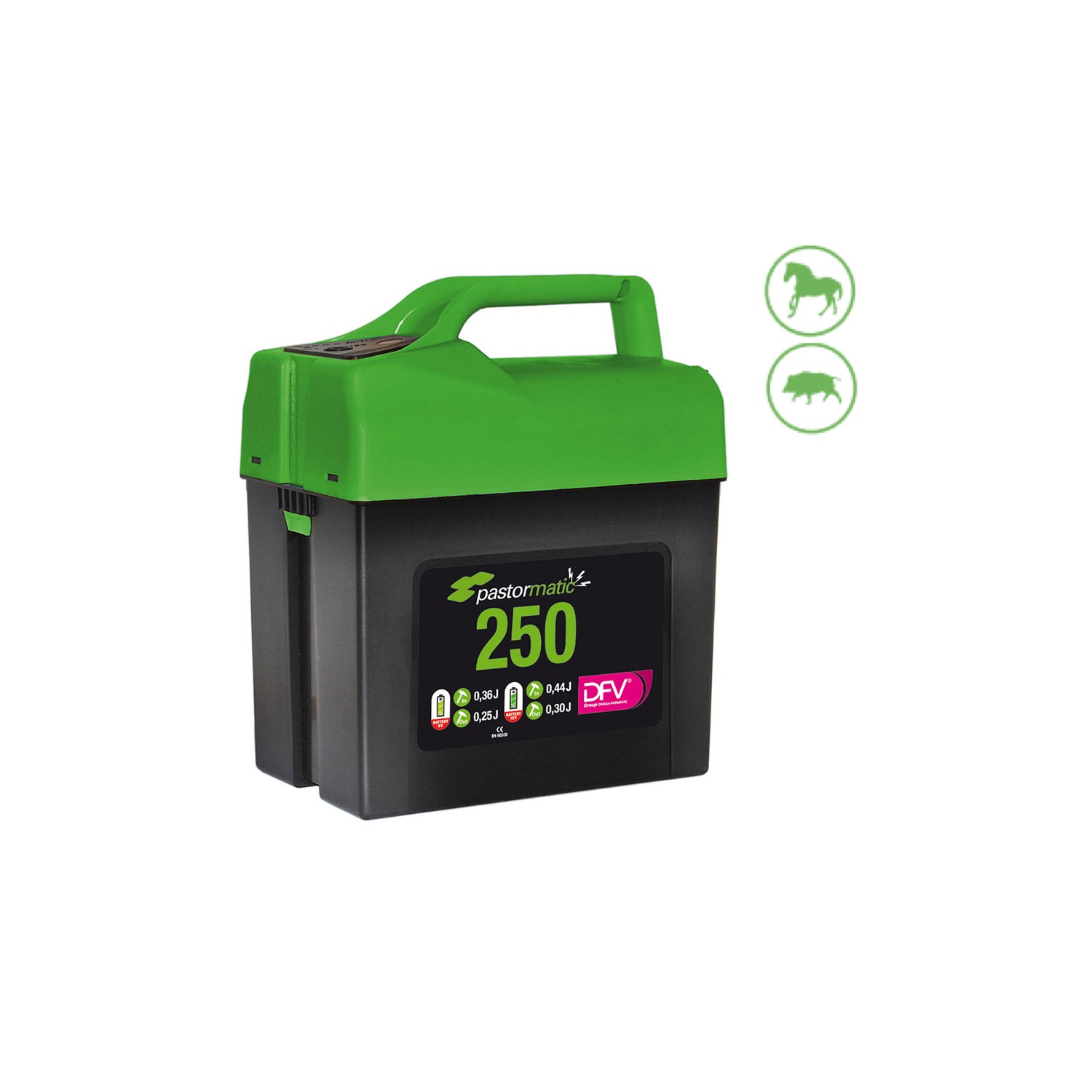 Pastor 250 9v pastormatic. modelo que funciona tanto a pila de 9v. (0,25j) como batería de 12v (0,30j). doble selector de potencia/consumo con luz led de funcionamiento. ideal para cercas pequeñas de hasta 4km para vacuno leche y caballos. permite opción solar, opción batería recargable y opción con pila 9v de día y panel solar de noche. incluye piqueta de tierra, soporte pastor para piqueta, placa señalización y tomas de tierra y línea. garantía 3 años. . conexión 9v. potencia almacenada 0,36j. potencia salida 0,25j. voltaje máximo 9400v. voltaje a 500 ohm: 2900v. consumo 18.28mah. batería no incluida
