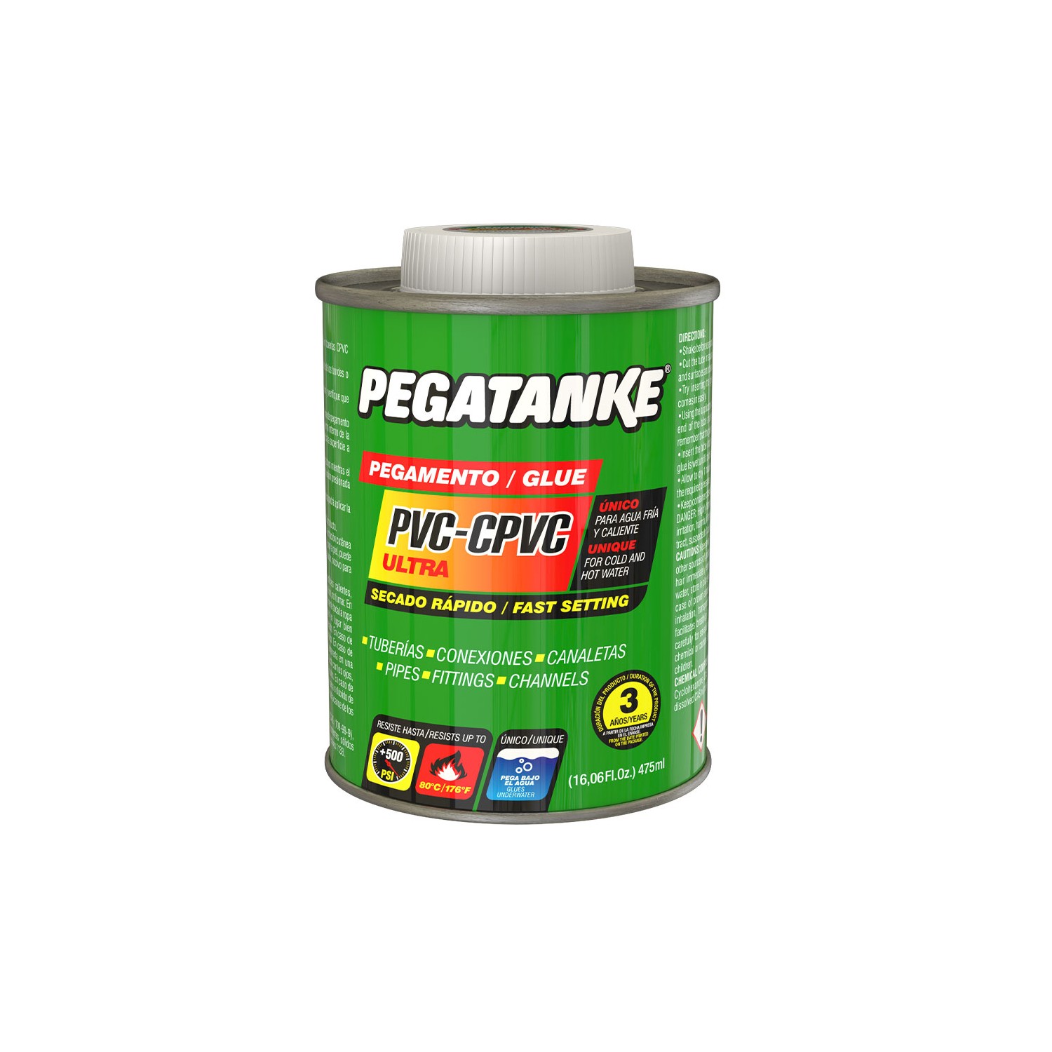 Pegatanke pvc-cpvc 475ml pegamento para union de tuberias de pvc-cpvc, color verde con un aplicador dentro de la lata, alta resistencia, pega bajo el agua. pega cualquier tipo de tuberia o canaleta de pvc-cpvc, presenta una resistencia a +500psi, 80ºc puede ser aplicada bajo el agua o en superficie humedas, el curado completo se logra en aprox dos minutos y medio, resiste más de 500psi