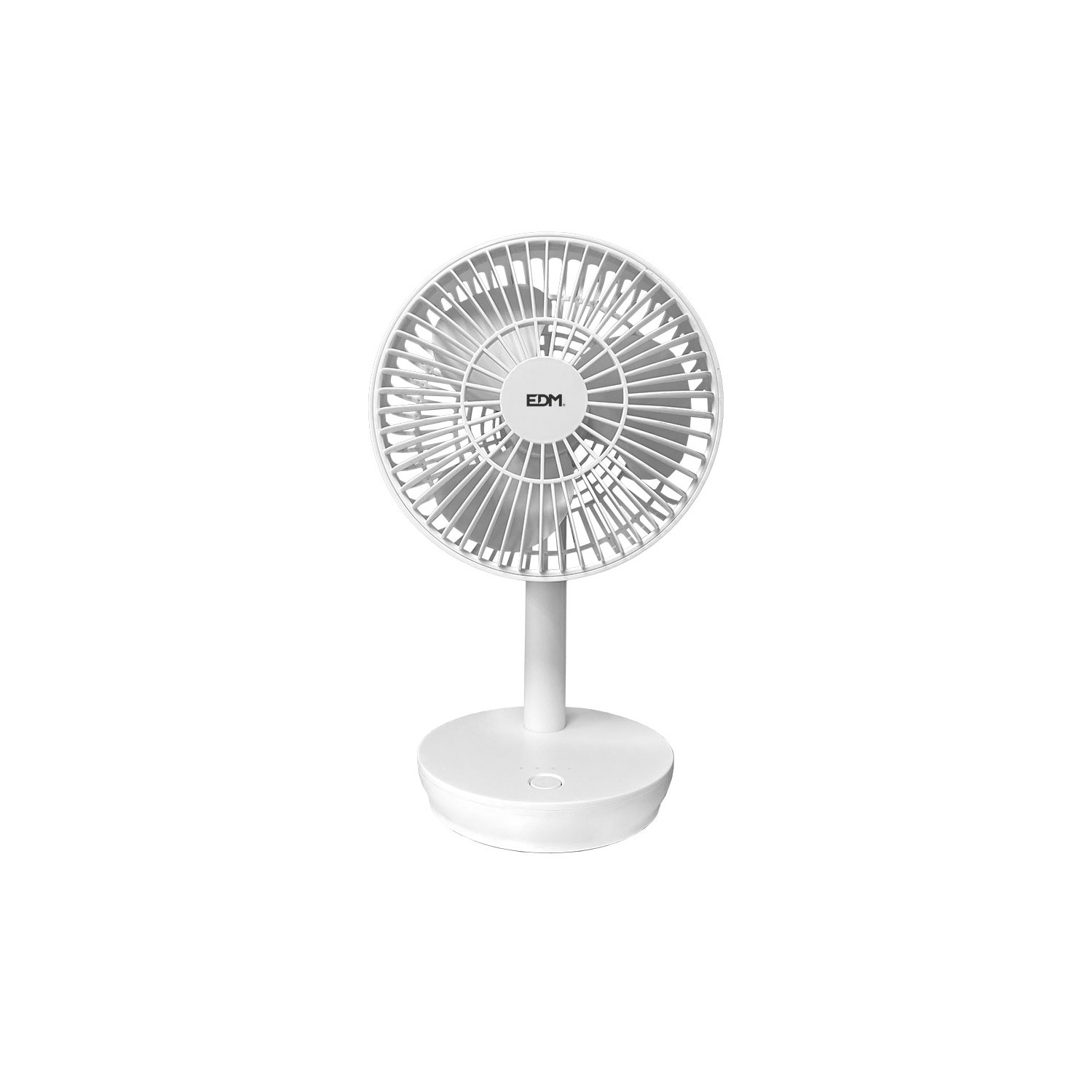 Ventilador de sobremesa recargable blanco potencia: 5w aspas: ø14,5cm medidas: 17x13x26cm. 4 velocidades con indicado de led.cabezal ajustable. caudal de aire 525m³/h. 31,6 db. 5v-1a - usb bateria recargable 2000mah (autonomia aprox.3h) tiempo de carga: 4-5h. 3 aspas