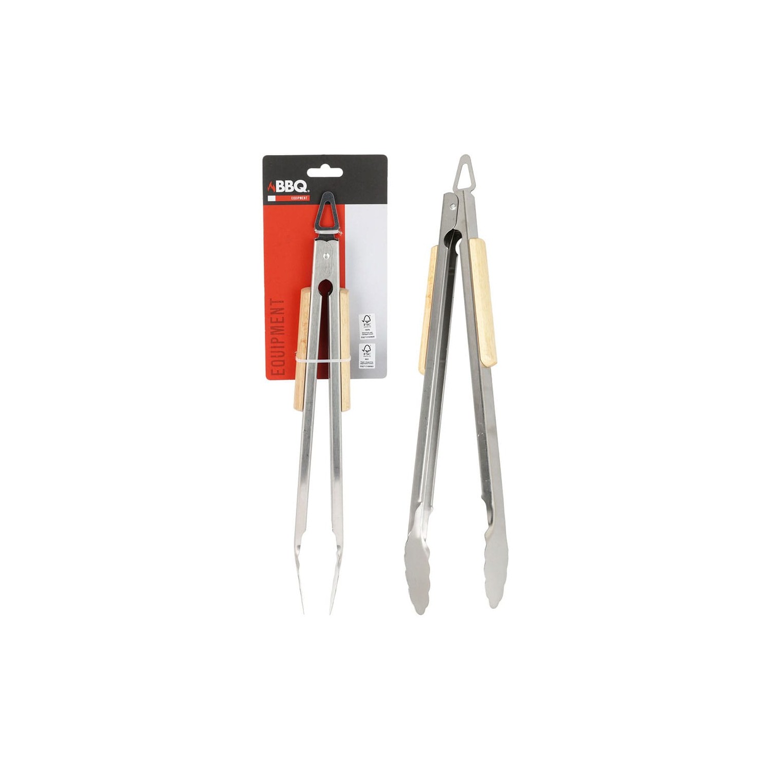 Pinza para barbacoa, material acero inoxidable con mango de madera semi redonda. medida 37,5 cm