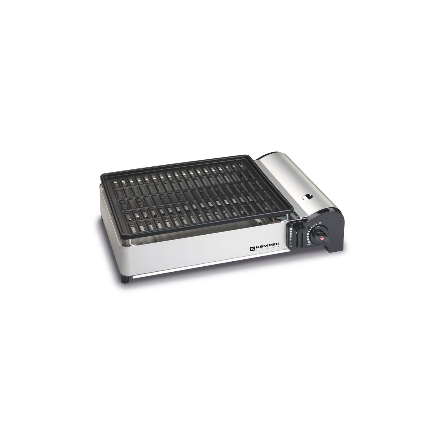 Barbacoa portátil para cartucho de butano con conexión de bayoneta, encendido piezoeléctrico, potencia regulable, parrilla de aluminio (27 x 34 cm) con revestimiento antiadherente, bandeja para la grasa extraible, con saco de transporte 1,9 kw, 138 g/h 45 x 32 x 9 cm