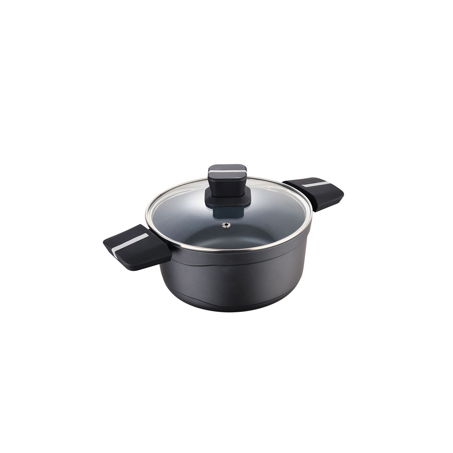 Cacerola ø24x12cm aluminio fundido 1,7mm de grosor ind con tapa bistro grey sg6426 san ignacio. cacerola con tapa interior en aluminio fundido revestimiento exterior en acero quantanian wool en negro mate. dot inducción negro asa soft touch con inserto de silicona gris