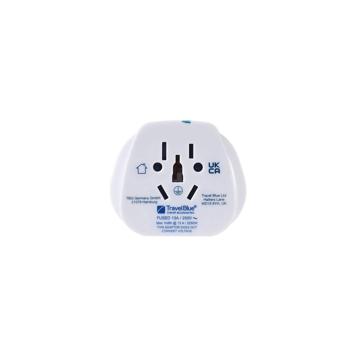 Adaptador entrada multiple mundial a salida clavija reino unido, tb-904 este adaptador permite a viajeros del mundo utilizar sus aparatos electrónicos en el reino unido. este adaptador no convierte voltaje. comprobar la compatibilidad del aparato con el voltaje local antes de insertar el enchufe max 13a de carga , 250v . fusible 13a. seguridad probada con la norma británica 5733 y las cláusulas de bs1363 parte 3. travel blue