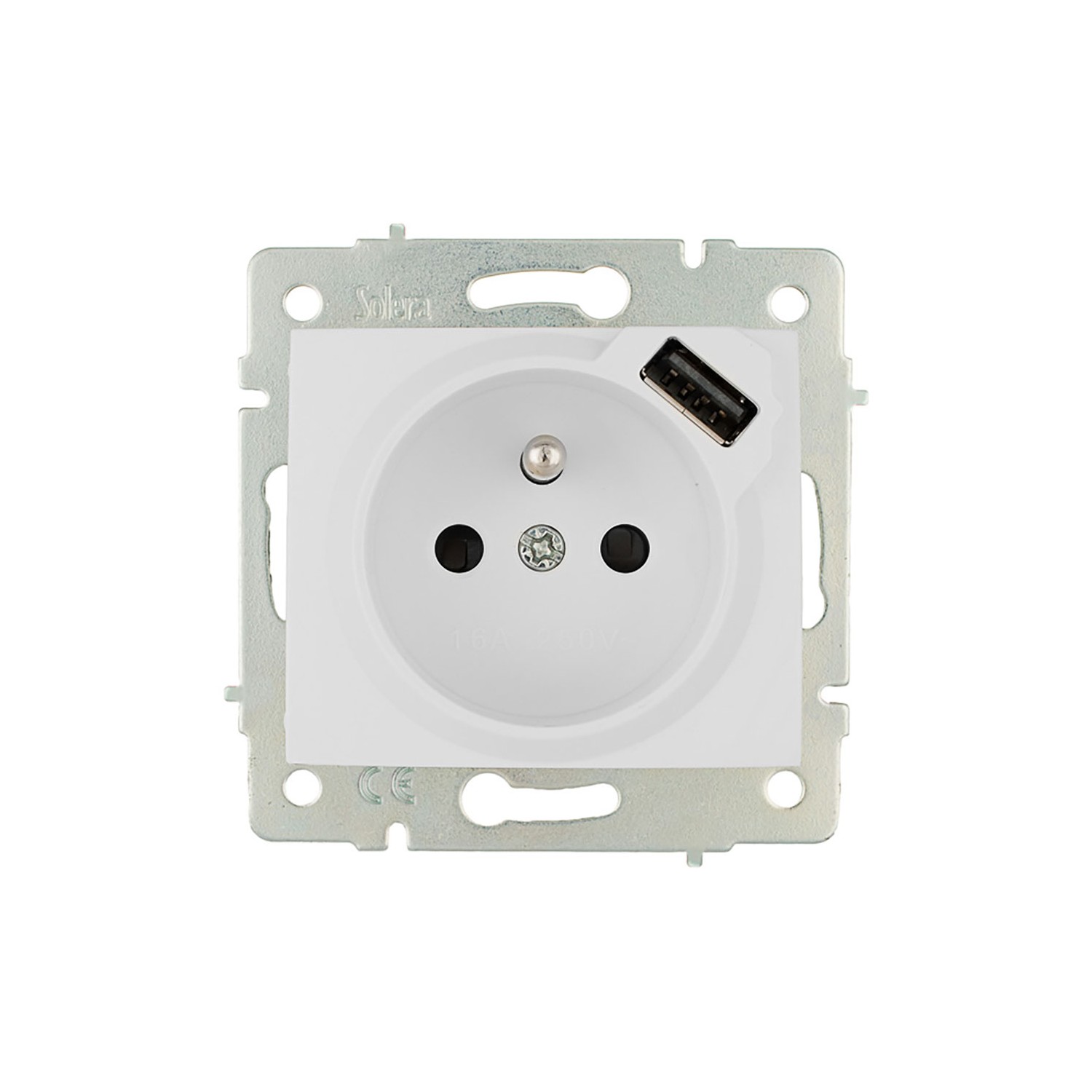Base bipolar con t/t con toma francesa 16a 250v con usb con obturador 83x81mm color blanco, contactos de plata de alto poder de ruptura. usb 2,1a 5v. embornamiento por tornillo serie europa solera erp60fusb