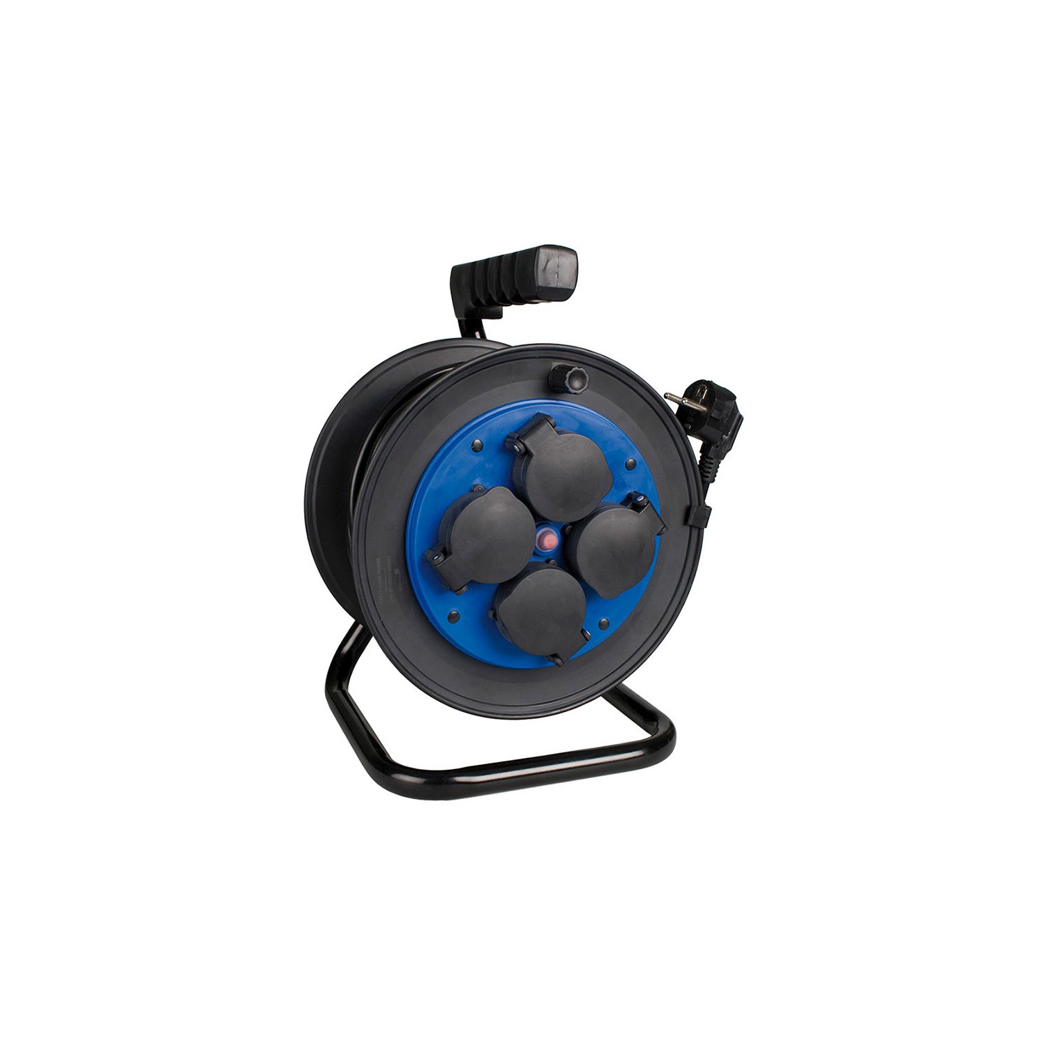 Enrollacable 25m 3x1,5mm con 4 tomas bipolares con t/tl con tapas solera. potencia maxima admisible extendido 3500w, potencia maxima admisible enrollado 1200w. 2p 16 a 250 v. tipo de cable h05vv-f 3x1,5mm. con limitador de potencia. ip54 7425/1t
