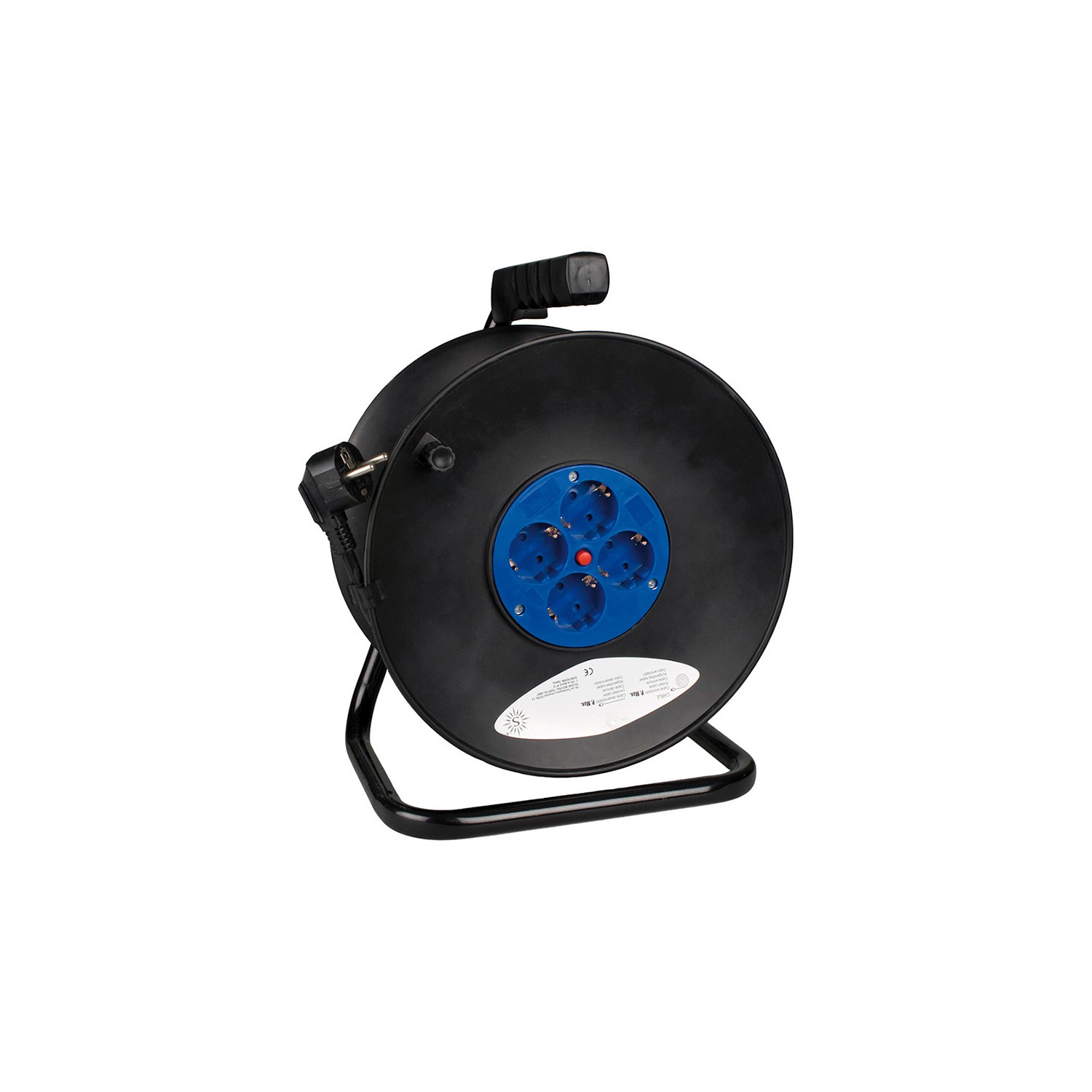 Enrollacable 25m 3x1,5mm con 4 tomas bipolares con t/tl solera. potencia maxima admisible extendido 3500w, potencia maxima admisible enrollado 1200w. 2p 16a 250 v. tipo de cable h05vv-f 3x1,5mm 7425/2