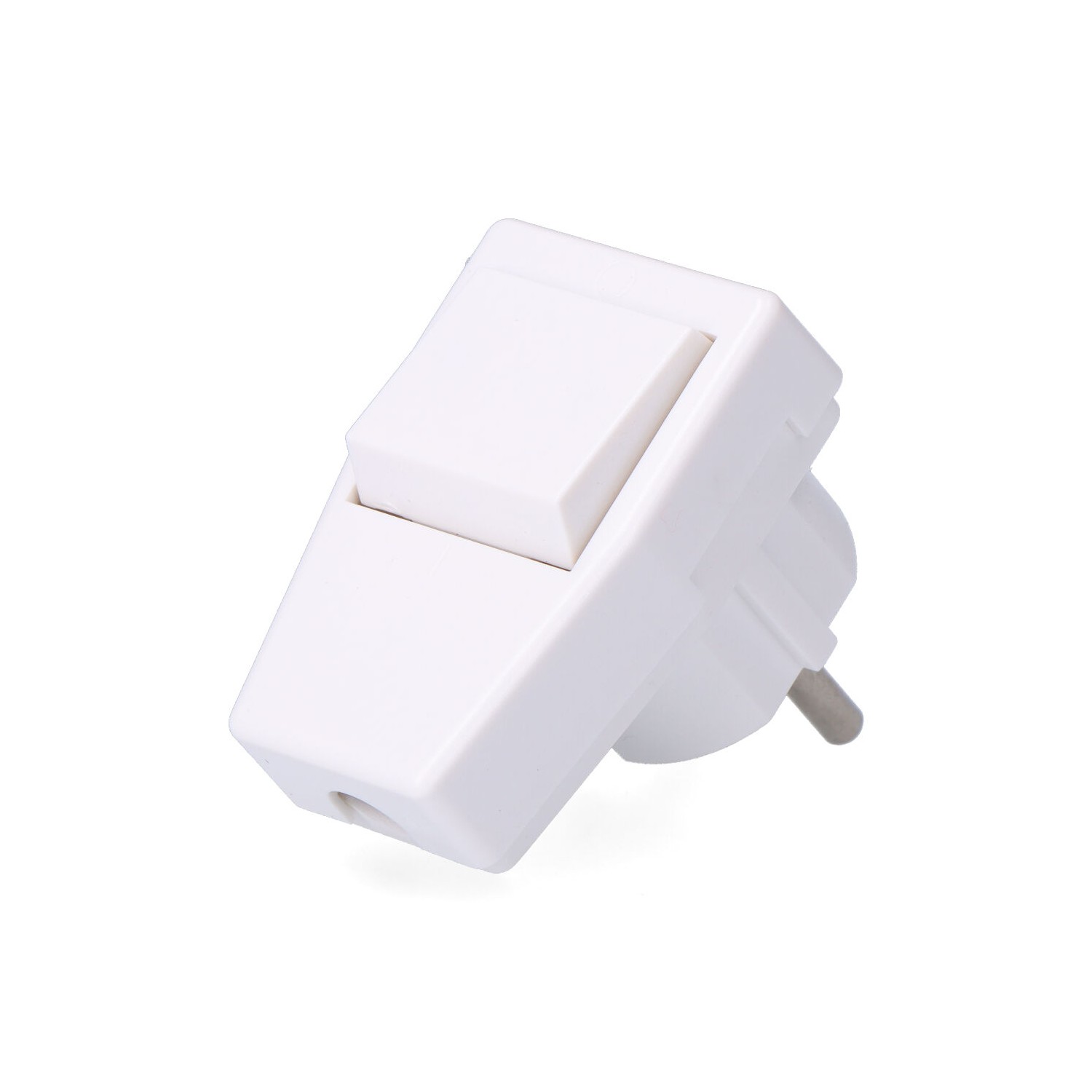 Clavija con t/t tipo schuko + interruptor, blanca, termoplástica, permite desconectar sin desenchufar la clavija, 40 x 65 x 62 mm (retractilado)
