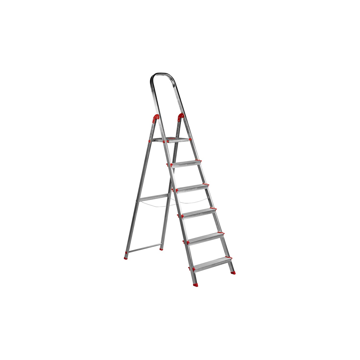 Escalera de 6 peldaños, de aluminio. arco de apoyo con altura de seguridad de 60 cm, peldaños antideslizantes y con sistemas de puntos fuertes, rellano con sistema de seguridad y amplia superficie de apoyo. resistencia de carga: 150 kg. altura máxima: 122 cm (hasta plataforma), altura alcanzable: 3,22 m. escalera certificada por aenor según norma europea en-131. dimensiones: 49,1 x 11,5 x 198 cm