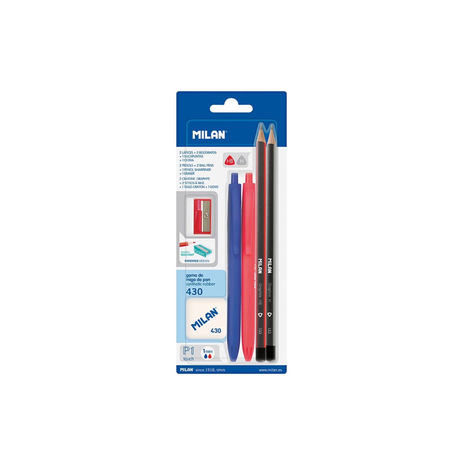 Blister con 2 bolígrafos p1 (azul/rojo), 2 lapices grafito hb y h, goma 430 y sacapuntas milan . incluye: 1 bolígrafo p1 azul y un bolígrafo p1 rojo, 2 lápices de grafito triangulares, graduación hb y h, 1 goma 430 suave de caucho sintético tipo "miga de pan", para borrar una amplia gama de lápices de grafito sobre toda clase de papeles, y 1 sacapuntas basic. colores / modelos surtidos