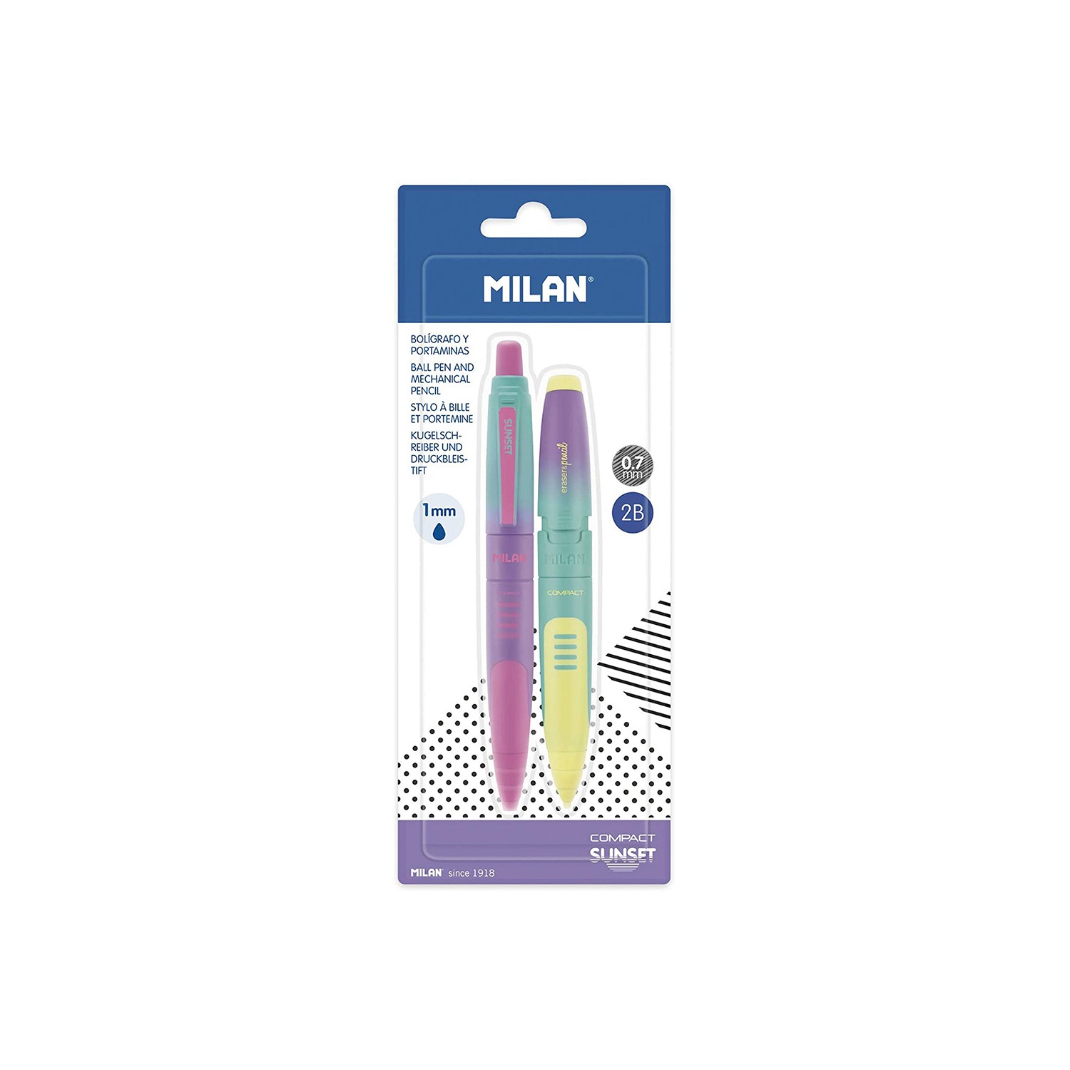 Blístercon 1 bolígrafo + 1 portaminas compact sunset milan. tinta azul. longitud de escritura aproximada de 1000m. punta 1mm. tinta fabricada en alemania. pulsador con retorno. portaminas eraser&pencil compact edición sunset. mina de grafito 0.7 mm dureza 2b, gruesa y suave, que facilita la escritura y es también apropiada para el dibujo artístico. goma milan extra-grande. diseño original creado por el departamento de i+d de milan. 4 colores surtidos: amarillo, lila, rosa y turquesa. medidas bolígrafo: ø1,4x14,1x1,7cm. medidas portaminas: 13x1,8x1,6cm