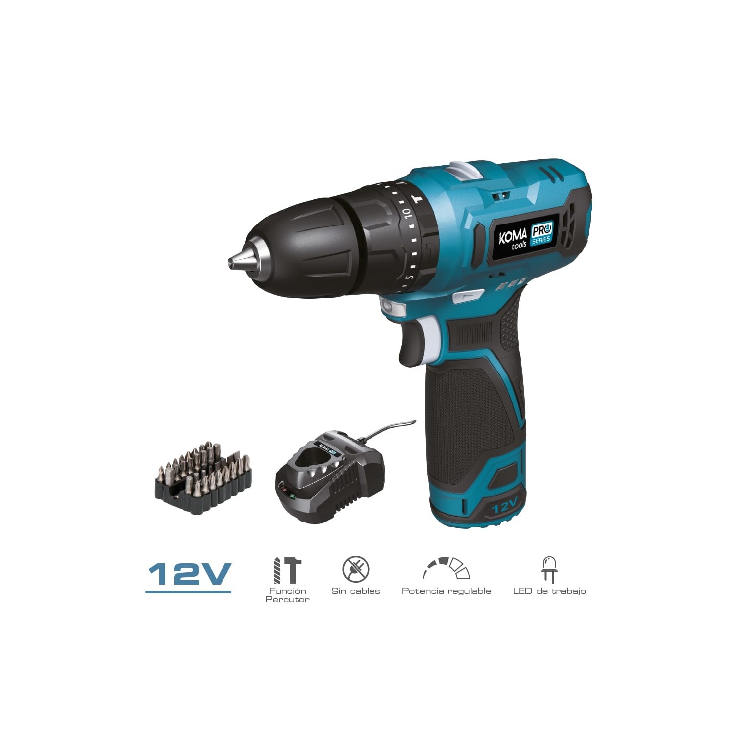 Taladro percutor 12 v, mandril ø10 mm sin llave, 2 velocidades, giro libre 400/1300 rpm, ratio impacto 6000/19500 bpm, apriete ajustable máx. 32 nm selecionable 21+1+1. luz led y indicador de batería. incluye batería 2.0 ah 12 v con carga auxiliar usb c, cargador 50 w 2,4 v, tiempo de carga aprox 3 - 5 h, portapuntas imantado y puntas: rectas (s3,s4,s5,s6,67), 2xpho, 2xph1, 2xph2, 2xph3, 2xpzo, 2xpz1, 2xpz2, 2xpz3, t10, t15, t20, t25, t27, t30, t40, hex3, hex4, hex5, hex6. con maletín para guradar y transportar. 12v-tp-k. medida 17,9 x 16,6 cm.