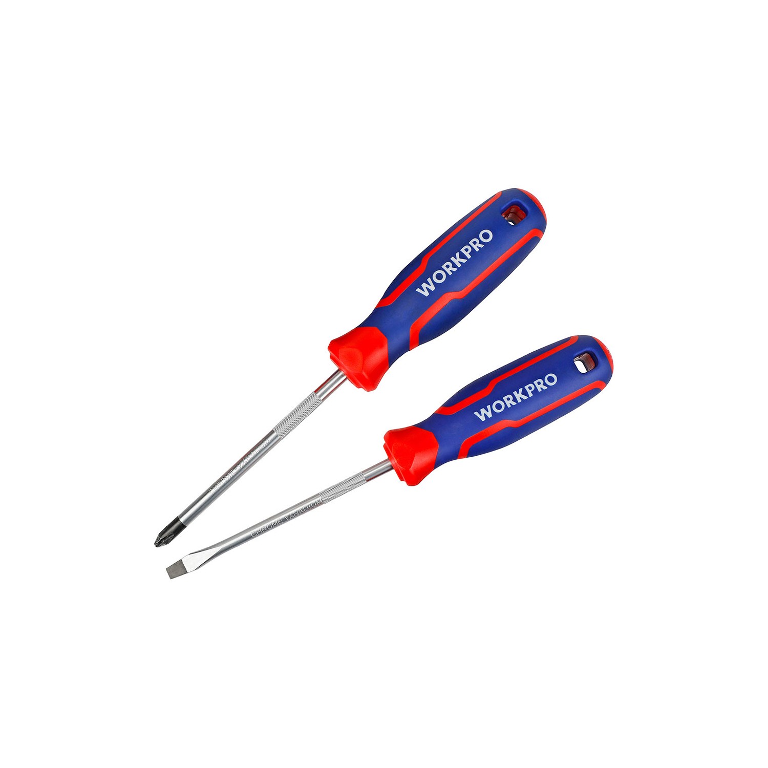 Juego de 2 destornilladores. hoja de cromo-vanadio. punta magnética negra. mango ergonómico de agarre cómodo. incluye: ph2 x 150mm, 6. 5 x 150 mm. color rojo y azul
