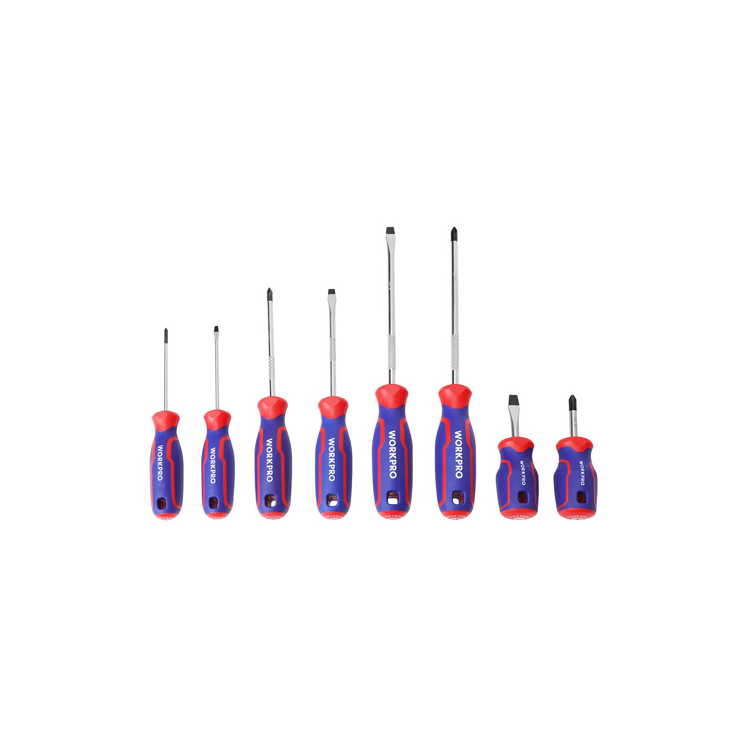 Juego de 8 destornilladores. hoja de cromo-vanadio. punta magnética negra. mango ergonómico de agarre cómodo. incluye: ph2 x 38 mm, ph2 x 150 mm, ph1 x 100 mm, ph0 x 75 mm 6,5 x 38 mm, 3 x 75 mm, 5,5 x 100 mm, 6,5 x 150 mm. color rojo y azul.
