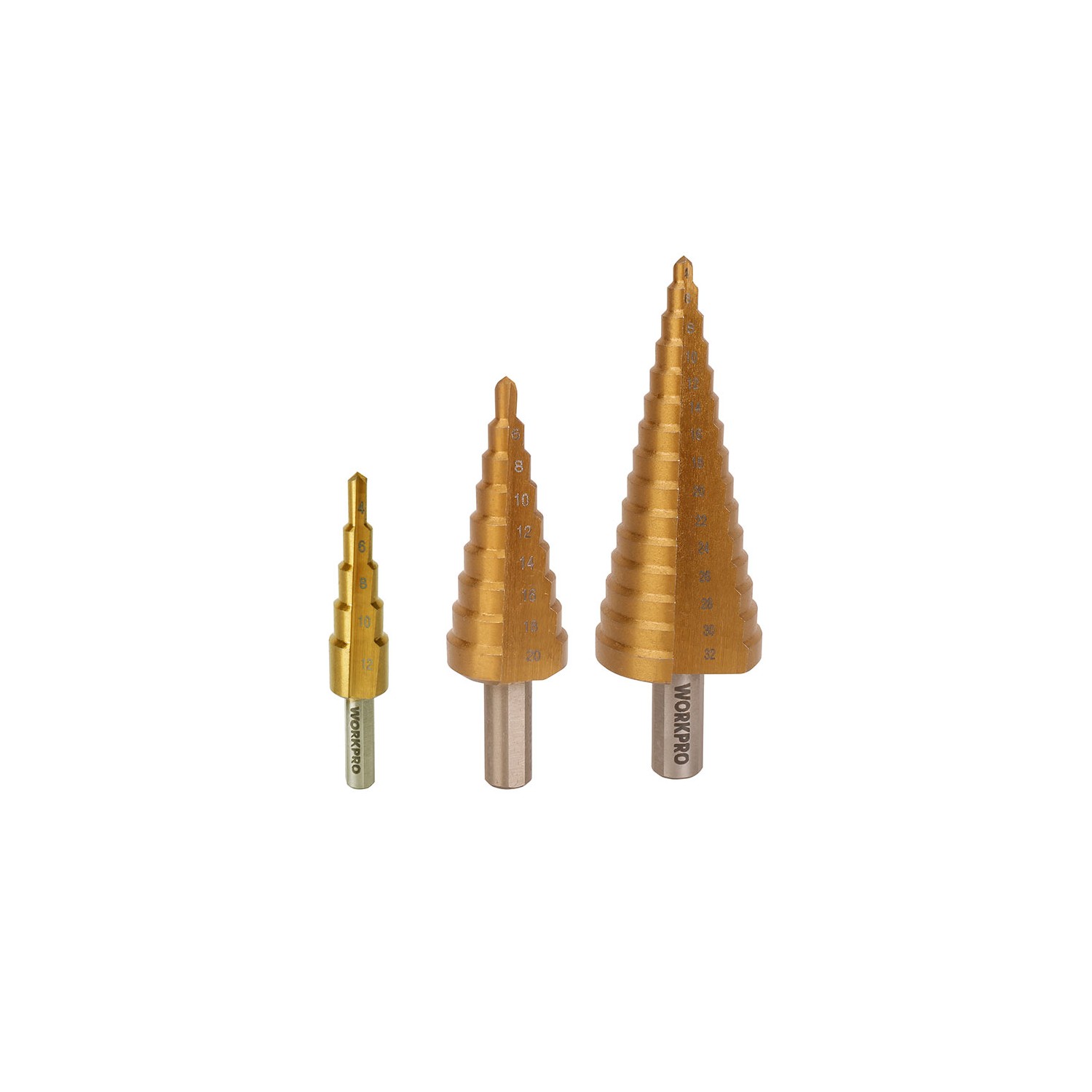 Juego de 3 brocas escalonadas material hss4241, tamaños: 1ª con 15 escalones:ø4, 6, 8, 10, 12, 14, 16, 18, 20, 22, 24, 26, 28, 30 y 32 mm 2ª con 9 escalones:ø4, 6, 8, 10, 12, 14 , 16, 18 y 20mm 3ª con 5 escalones:ø4, 6, 8, 10 y 12 mm