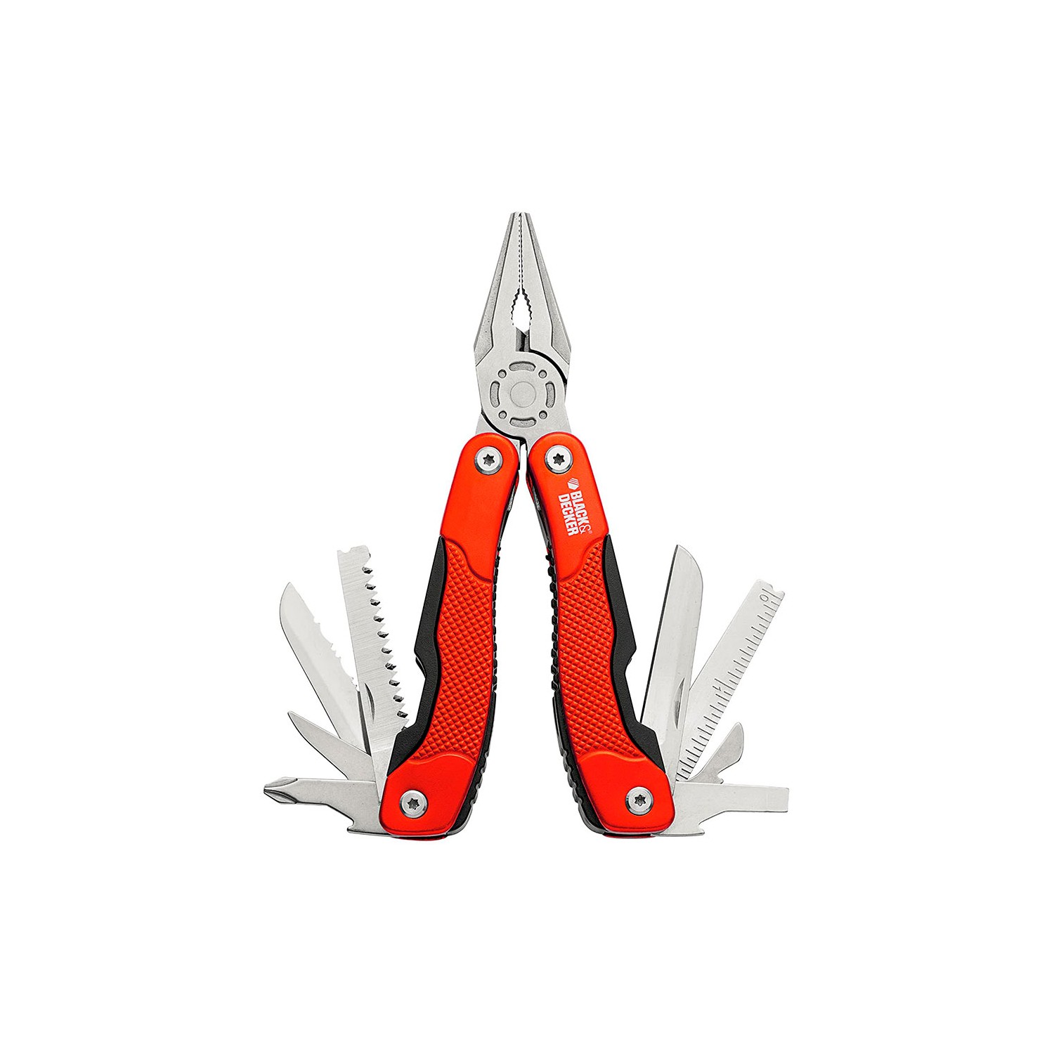 Multiherramienta incluye: pelacables, sierra, regla, 3 puntas para atornillar, 2 planas y una estrella. abrebotellas, abrelatas, 2 cuchillos con diferentes dentados y tamaños. alicate universal.