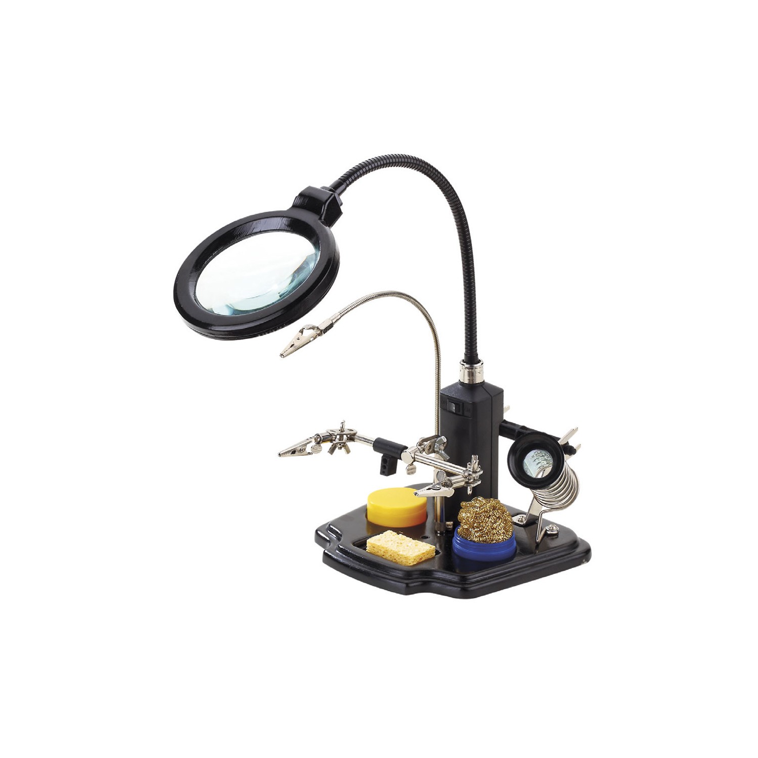 Soporte para soldador con lupa y pinzas de cocodrilo hrv7571 nimo. lupa con luz led integrada y accesorios para trabajos sin manos.este dispositivo incluye soporte de soldador, pinzas de cocodrilo, soporte para carrete de hilo de estaño, caja con flux para soldadura, y limpiador metálico en seco de puntas.contenido:lupa x3 con lente de 90mm diámetro, brazo flexo 265mm con iluminación led. soporte para carrete de hilo de estaño.base 190x170mm, peso 1,3kg