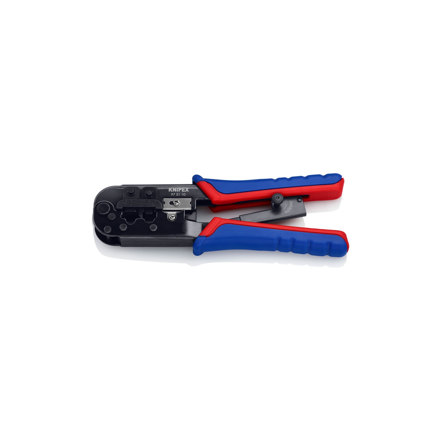 Crimpadora para entallar terminales 975110sb knipex. alicate para crimpar conectores western proceso de crimpado de gran exactitud, gracias al avance paralelo de las mordazas con sistema de bloqueo con dispositivo adicional para pelar cables redondos. alicate bruñido, mangos con fundas multicomponentes. 340g. dimensiones: 190x70x18mm. herramienta profesional para cortar y pelar la cubierta de cables telefónicos planos sin blindaje.para crimpar conectores western de 6 y 8 polos tipo rj 11/12 (ancho 9,65mm) y rj 45 (ancho 11,68mm) diseño largo. proceso de crimpado preciso gracias al crimpado en paralelo. de gran calidad gracias al sistema de bloqueo con mecanismo de liberación automática. con guillotina y cuchilla pelacables para cables planos de 6 y 12mm de longitud. con dispositivo adicional para pelar cables redondos. acero eléctrico al cromo vanadio de calidad especial, templado al aceite.