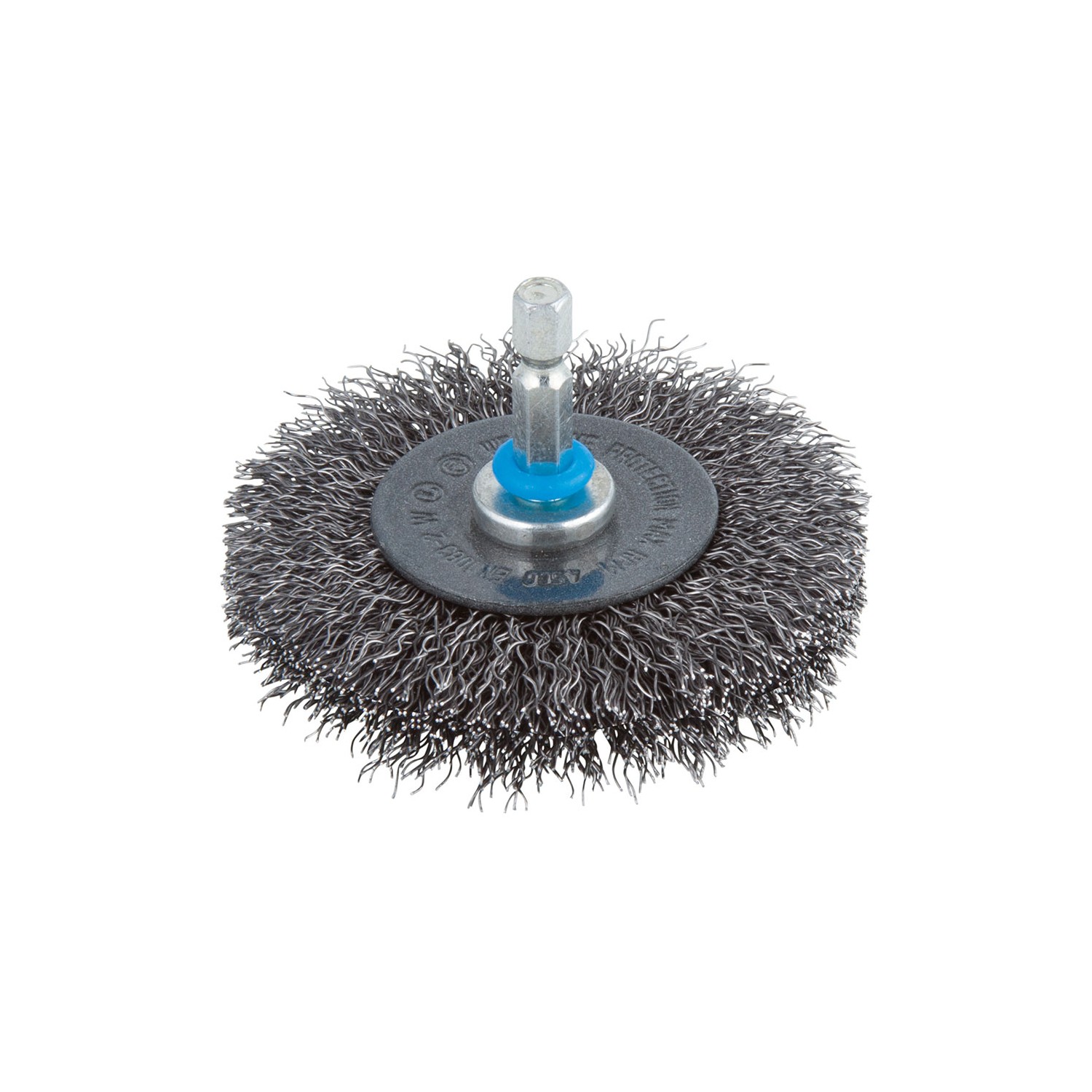 Cepillo de disco de alambre de acero diámetro de trabajo: 75 mm altura de guarnición: 10 mm longitud del alambre: 15 mm versión de vástago: vástago hexagonal de 6,35mm, 1/4 longitud de vástago: 25 mm dimensiones: 75 x 75 x 34 mm