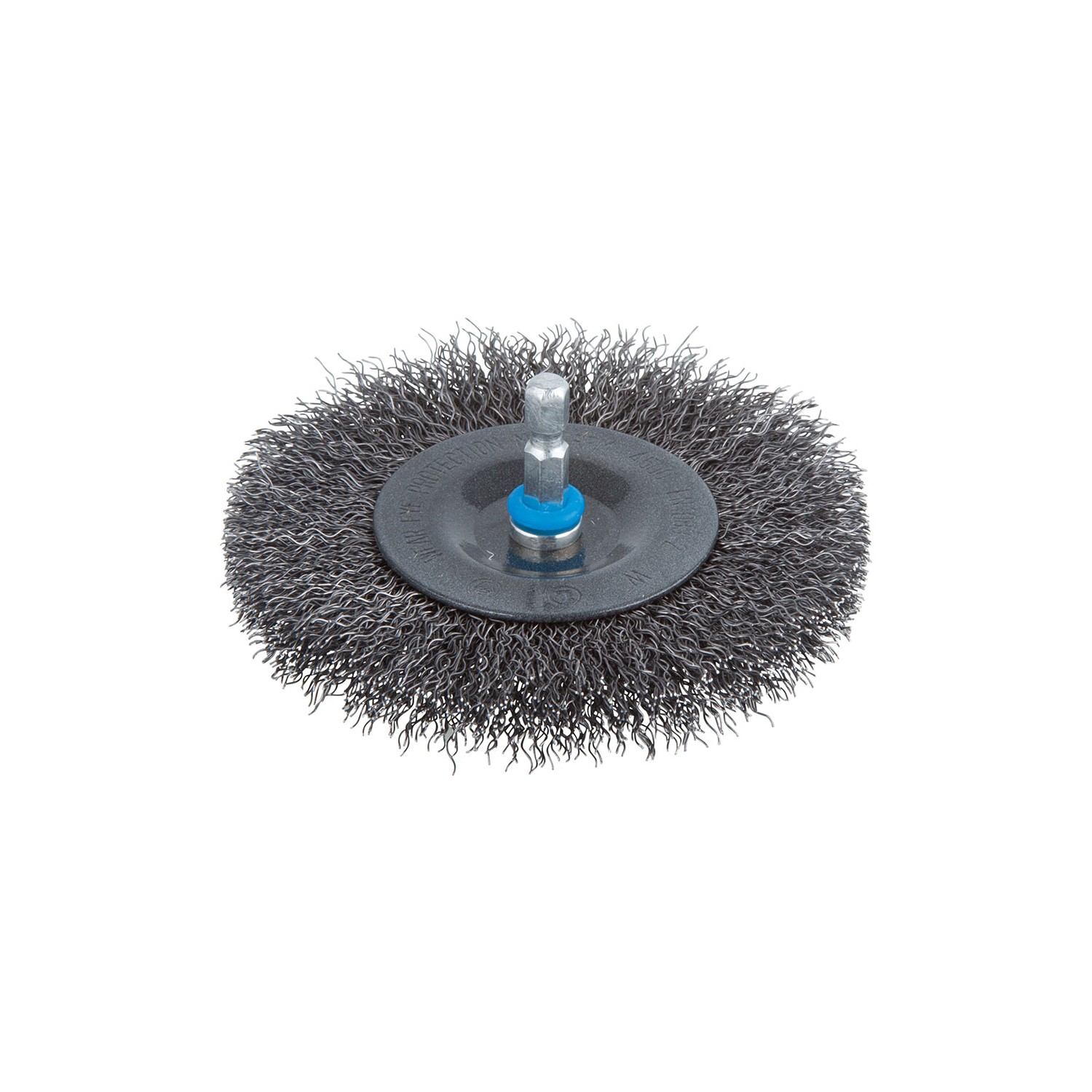 Cepillo de disco de alambre de acero diámetro de trabajo: 100 mm altura de guarnición: 10 mm longitud del alambre: 23mm versión de vástago: vástago hexagonal de 6,35 mm, 1/4 longitud de vástago: 25 mm dimensiones: 100 x 100 x 34 mm