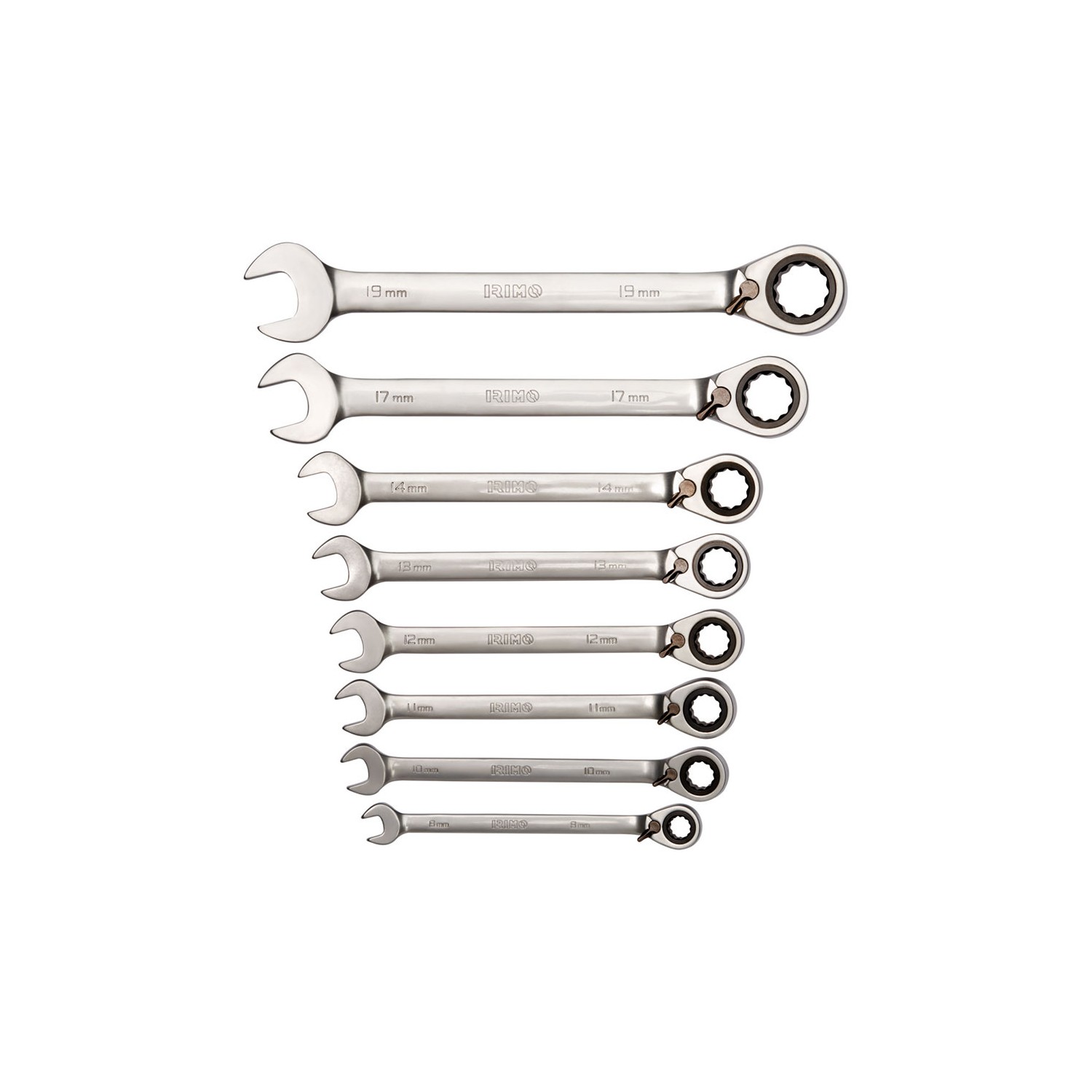 Juego 8 llaves combinadas carraca/fija 8-19mm 18-8-h. juego de 8piezas con soporte de plástico. componentes: llaves combinadas con carraca de 8 a 19mm. palanca de cambio rápido de sentido izquierda/derecha. ángulo de 15º para mejorar la manipulación y el acceso. acabado: cromado mate. material: aleación de acero de alto rendimiento. dureza: 40-50hrc. normas: iso1711-1 y din3113.