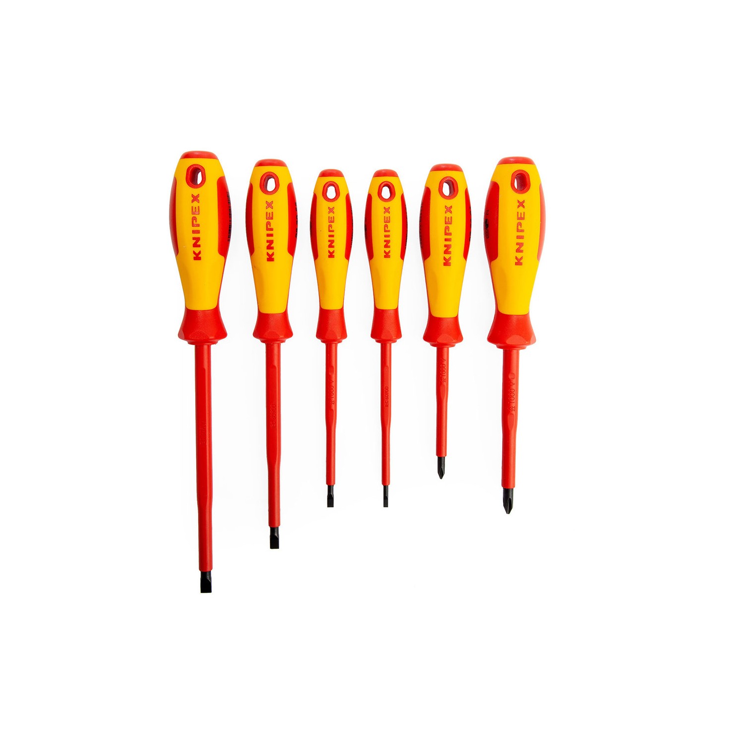 Juego de destornilladores vde 6 piezas knipex. tornillo plano/phillips. 1x98 20 30 destornillador tornillo plano 3,0mm ,1x98 20 40 sl destornillador (slim) tornillo plano 4,0mm, 1x98 20 55 sl destornillador (slim) tornillo plano 5,5mm ,1x98 20 65 sl ,destornillador (slim) tornillo plano 6,5mm1x98 24 01 sl destornillador (slim) para tornillos cruciformes phillips® ph1, 1x98 24 02 sl destornillador (slim) para tornillos cruciformes phillips® ph2. no contiene svhc. dimensiones: 171x37mm. peso: 550g.