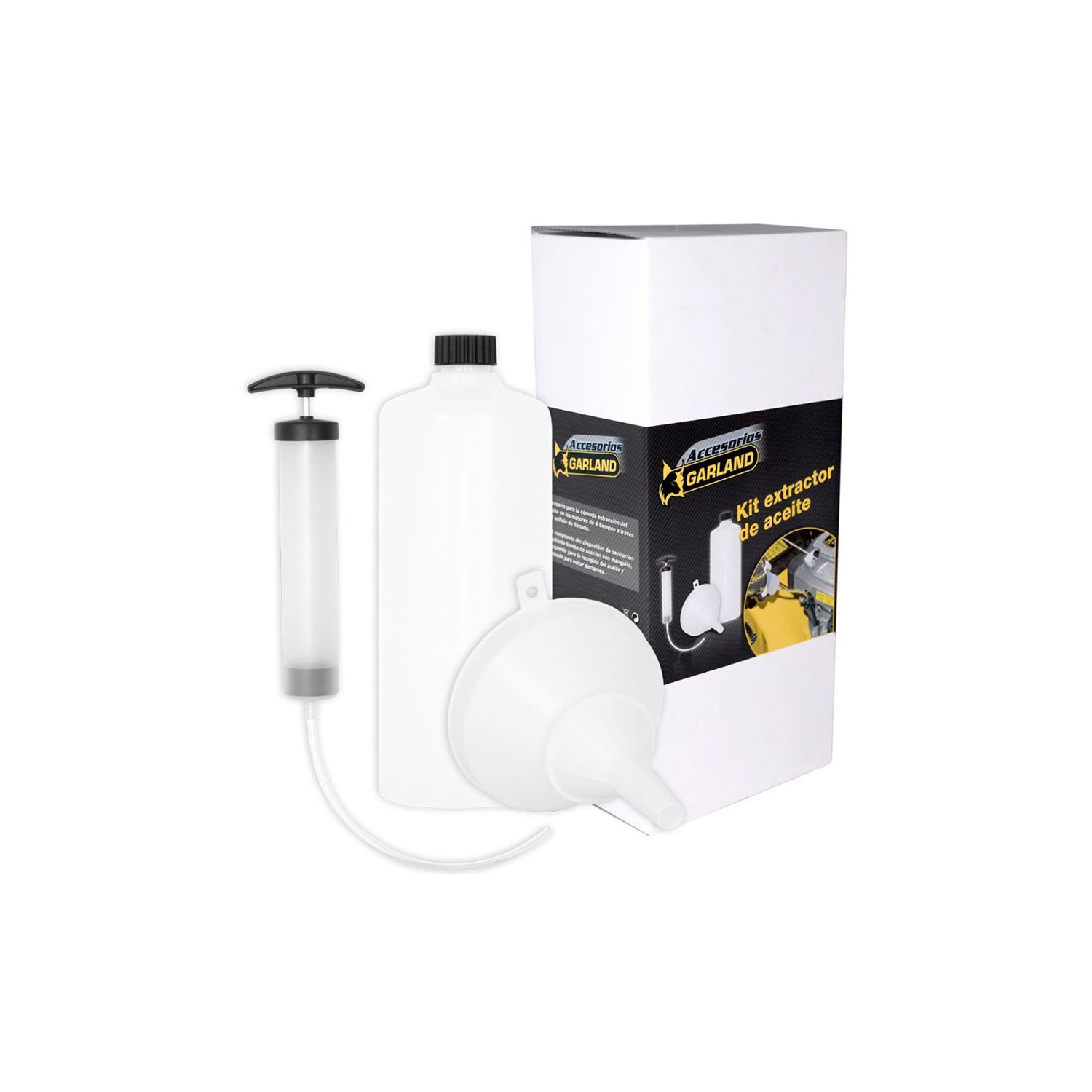 Kit completo, para extraer comoda y limpiamente el aceite en motores de 4 tiempos a traves del orificio de llenado. incluye dispositivo de aspiracion mediante bomba de succion con manguito, recipiente para la recogida de aceite y embudo antiderrames. garland