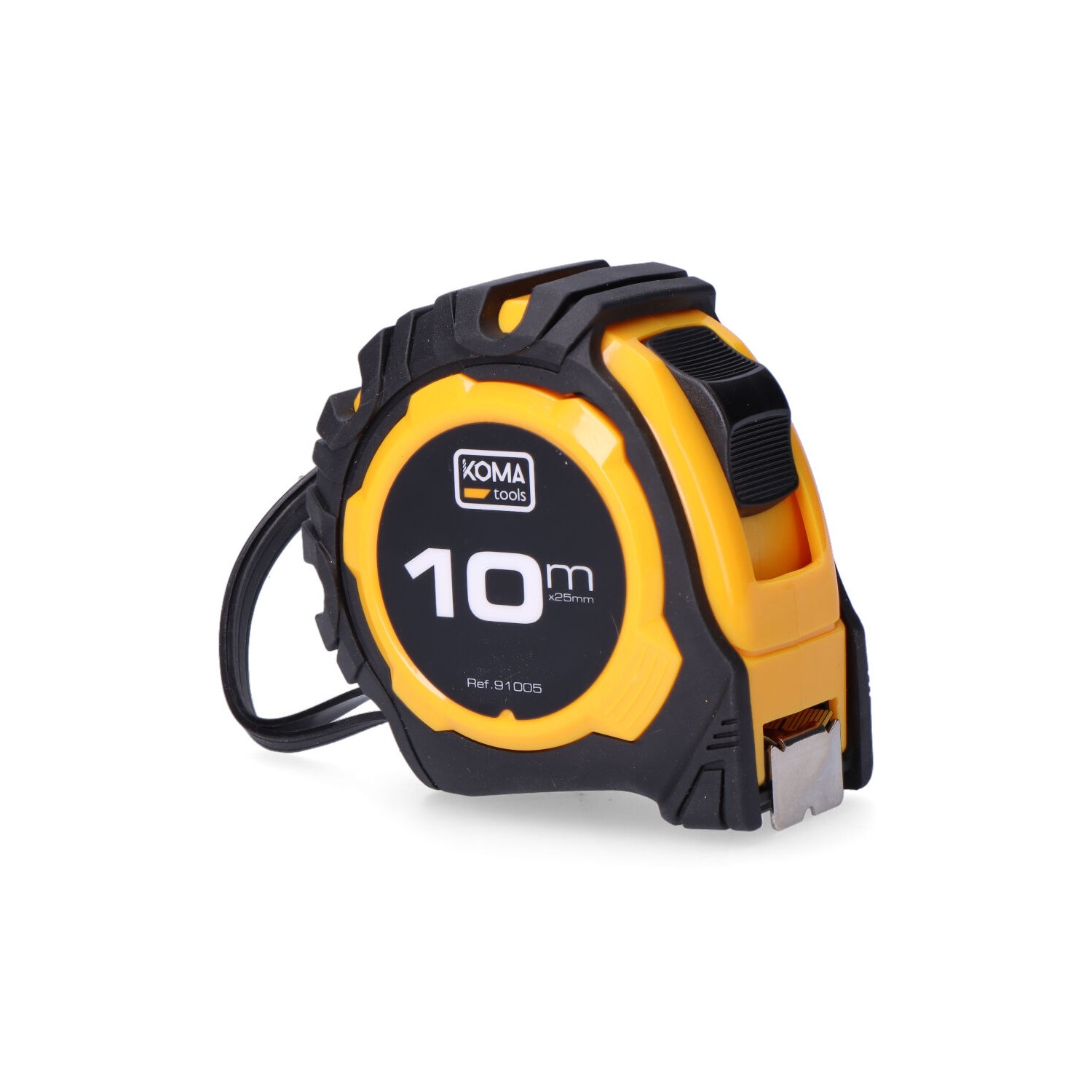 Flexómetro 10m x 25mm abs standard koma tools. cuerpo fabricado en abs antideslizante. dos posiciones de bloqueo, clip para cinturón. grosor de la cinta 0,105mm, cinta numeración amarilla acabado mate.