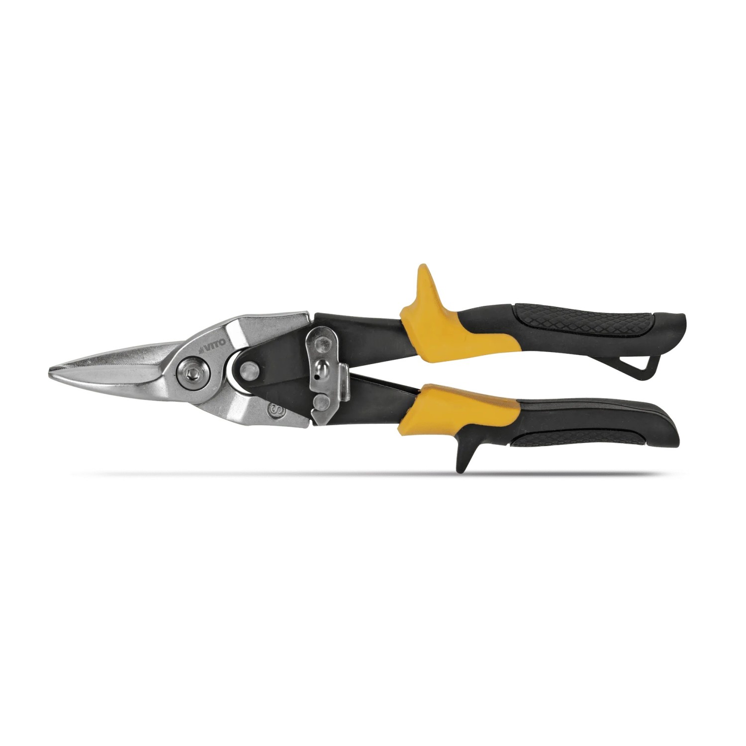 Tijera para cortar chapa corte recto con cuchillas en acero cromo vanadio y mangos en bimaterial, tiene un Bloqueo de seguridad con un corte metálica y chapa hasta 1,2 mm.