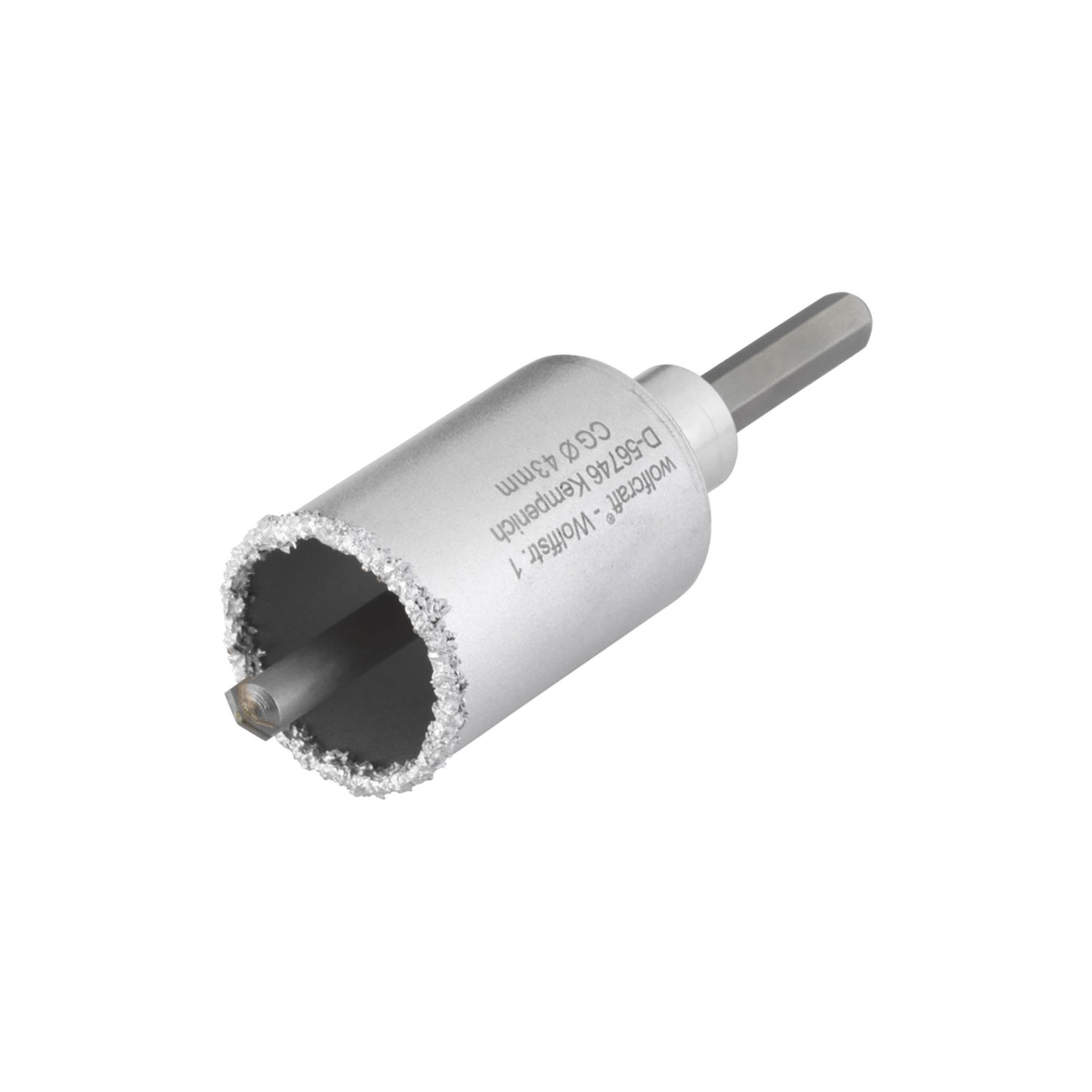 Corona de perforación recubierta de carburo de tungsteno, ø43 x 55 mm, profundidad máxima de corte 55 mm velocidad máxima de rotación 1.500 rpm para taladros en paredes de ladrillo y piedra, vástago hexagonal,con adaptador y broca centradora (ø8mm) preinstalados, certificación tüv