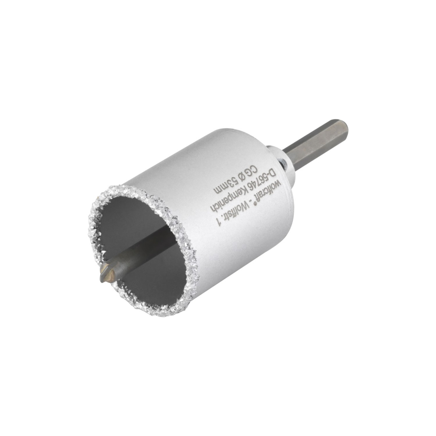 Corona de perforación recubierta de carburo de tungsteno, ø53 x 55 mm, profundidad máxima de corte 55 mm velocidad máxima de rotación 1.200 rpm para taladros en paredes de ladrillo y piedra, vástago hexagonal,con adaptador y broca centradora (ø8mm) preinstalados, certificación tüv
