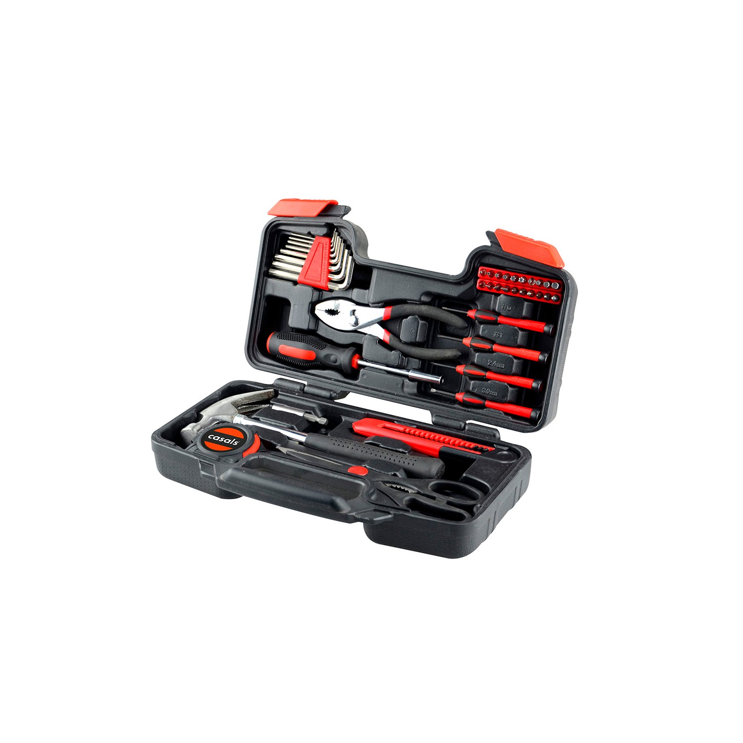 Maletín de herramientas con 39 piezas. contenido: 1 tijera, 1 martillo, 8 llaves allen, 1 cúter, 20 puntas de destornillador, 1 alicates universal, 1 cinta métrica de 3 m, 1 mango de destornillador, 4 destornilladores de precisión, 1 adaptador magnético para puntas de destornillador