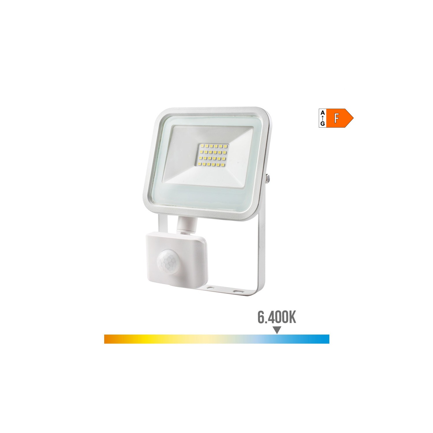 Foco proyector led blanco 20w 1520lm 6400k luz fria con sensor de presencia alcance ajustable de 2 a 10m - altura ajustable de 1,8 a 2,5m - angulo abertura del sensor 140° tiempo de retardo dels sensor minimo 10s y un maximo de 8min ip65 medidas:12,4x4,5x15,8cm 25000h 220-240v clase energetica f angulo de apertura: 120°, incluye conector de cables ip68. edm