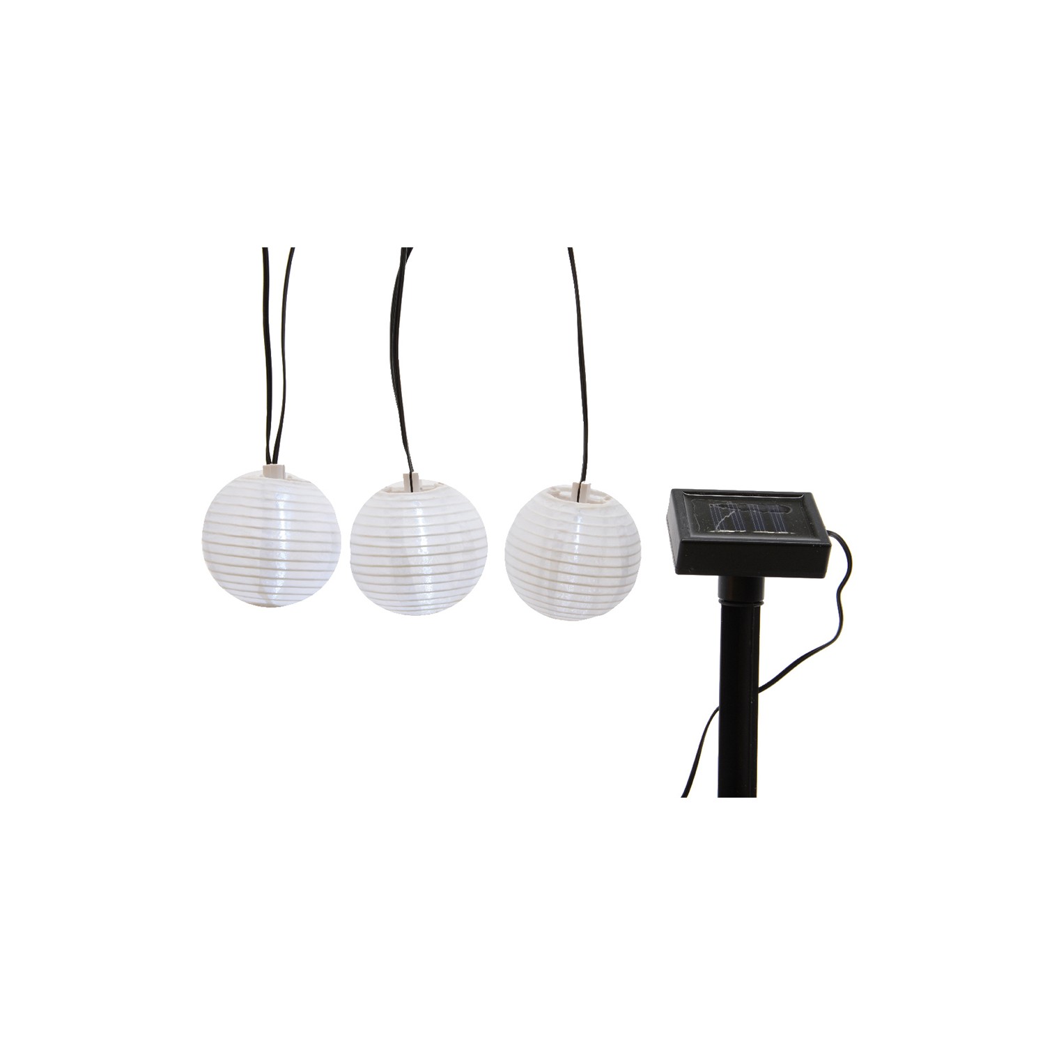 Guirnalda exterior solar incluye: 1 bateria 1xaa 200 mah. panel a primera bombilla 3m distancia entre bombillas 50cm de la primera a la ultima bombilla : 4,5m lumens: 1 - panel solar policristalino bombillas no reemplazables 7,5m