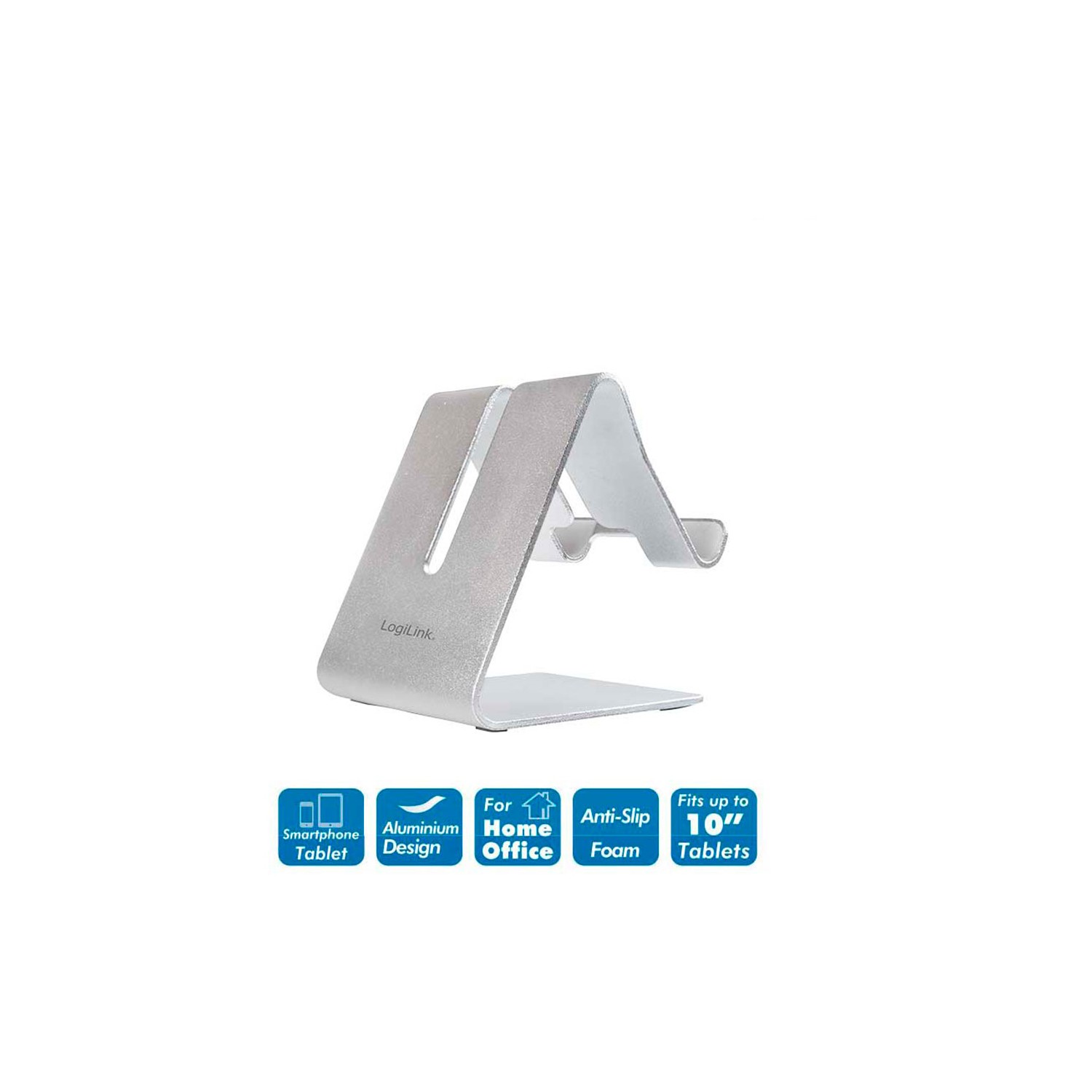 Soporte para smartphone y tablet, aluminio logilink. diseño de aluminio elegante, para uso doméstico y de oficina, adecuado para la mayoría de smartphone y tablet, espuma antideslizante para proteger el dispositivo y la mesa de arañazos, ángulos de visión duales: vertical para video chat y horizontal para trabajar o leer - peso: 0,06 kg, dimensiones: 6,3x7,5x7,5cm (ancho/fondo/alto)