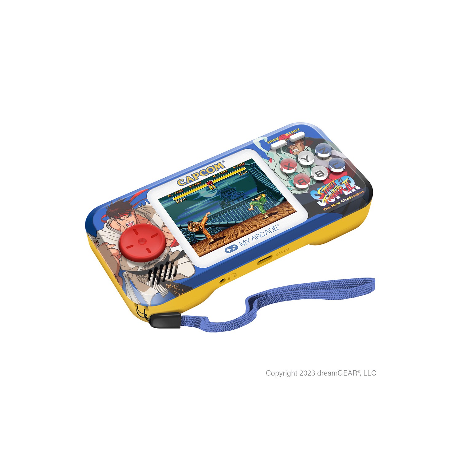 Pocket player pro super street fighter ii portable gaming system (2 juegos en 1) título con licencia oficial pantalla 2,75" de alta resolución a todo color. contiene: super street fighter ii: the new challengers y street fighter ii: special champion edition. altavoz incorporado con control de volumen. puerto de auriculares de 3,5 mm. brillo de pantalla ajustable. alimentado por 4 pilas aa (no incluidas) o un cable usb-c (no incluido). diseño ergonómico. incluye guía de usuario y lanyard