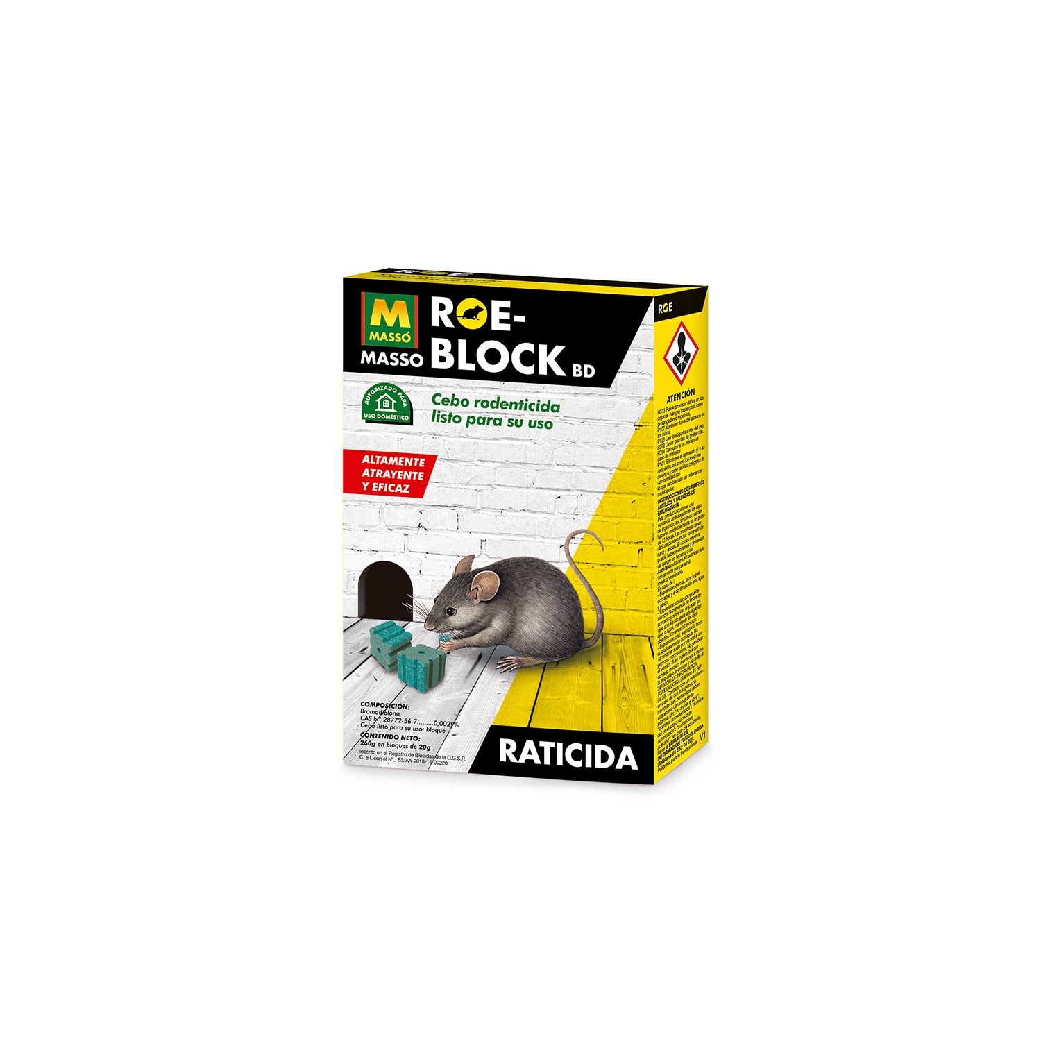 Raticida roe-block plus 260g. massó cebo raticida en forma de bloque. elimina ratas, ratones y topillos y toda clase de roedores. tiene una buena combinación entre una gran apetencia y una máxima resistencia a la humedad. perforado longitudinalmente para ser colgado sin apoyarlo en el suelo. utilice los biocidas de forma segura. lea siempre la etiqueta y la informacion sobre el biocida antes de usarlo" 231534 massó "