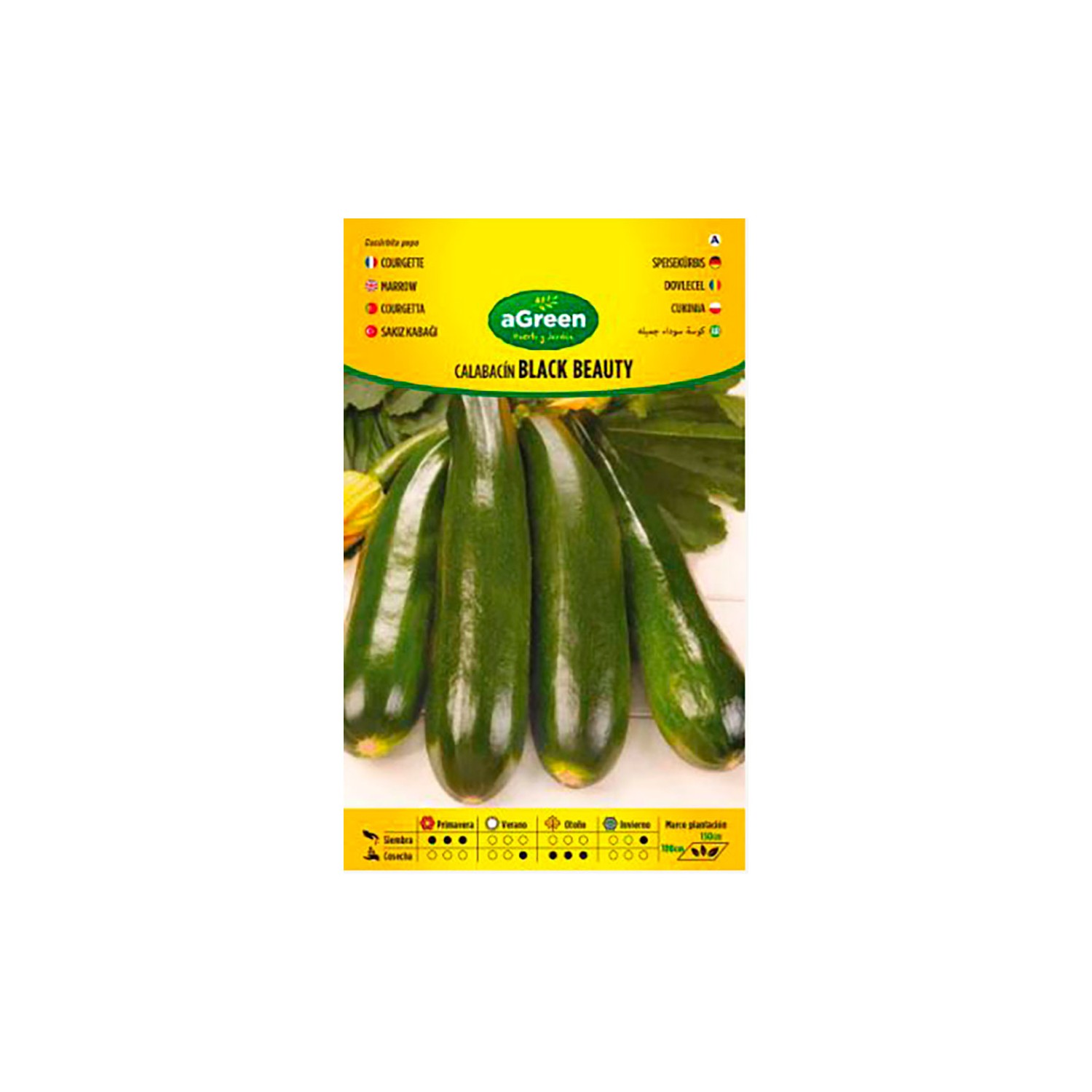 Sobre con semillas de calabacin black beauty agreen. frutos finos, alargados, de extremos romos y coloración verde. planta muy productiva.