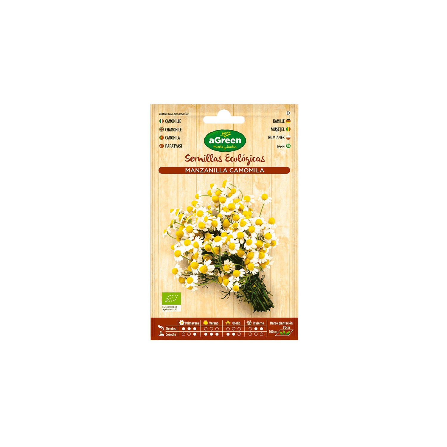 Sobre con semillas eco de manzanilla agreen. sus flores se utilizan como infusión muy apreciada por su sabor, y en medicina como digestivo, antiséptico, estimulante y refrescante.