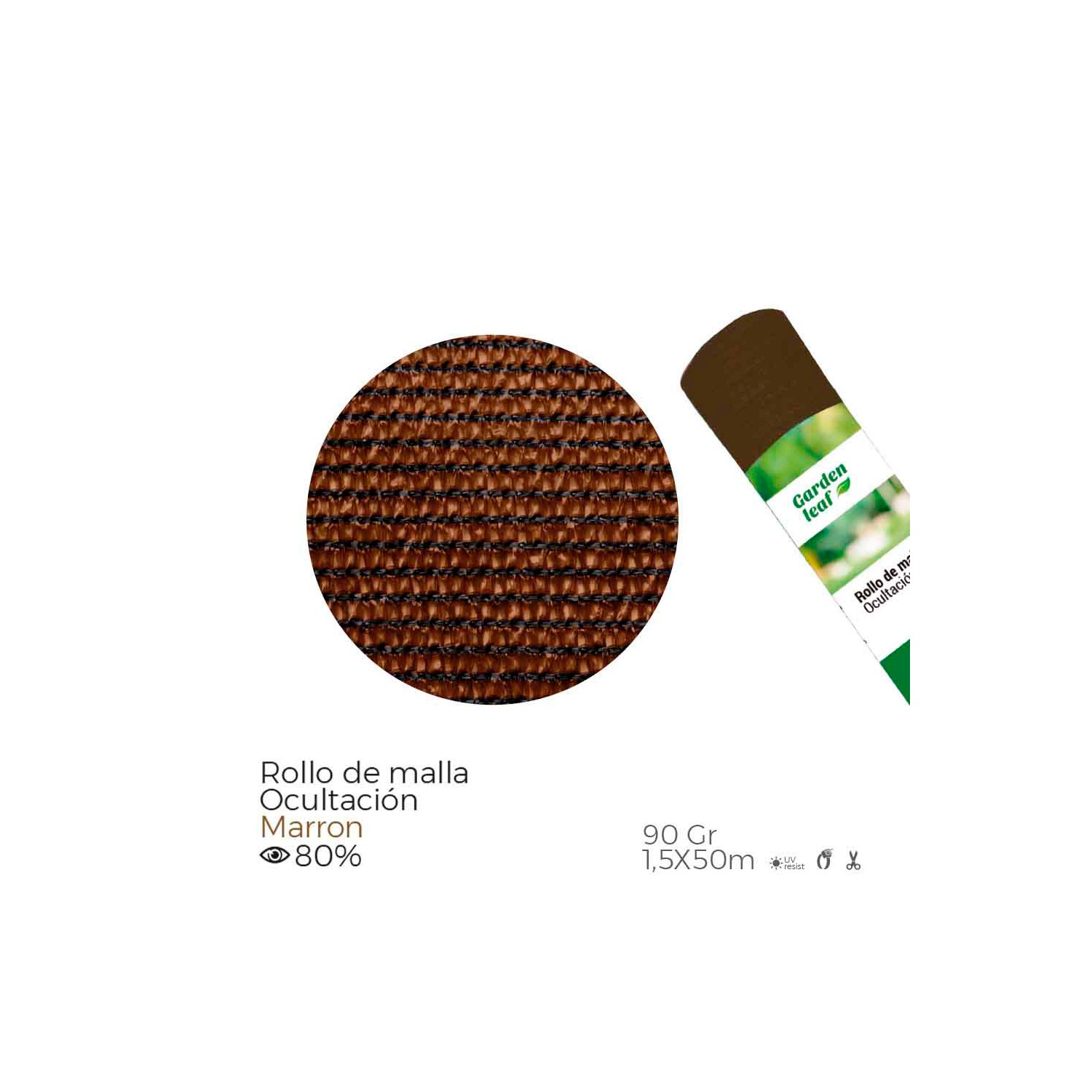 Rollo de malla 80% de ocultación color marrón, densidad 90g, medida 1,5x50m, material: polipropileno, resistente a los rayos uv