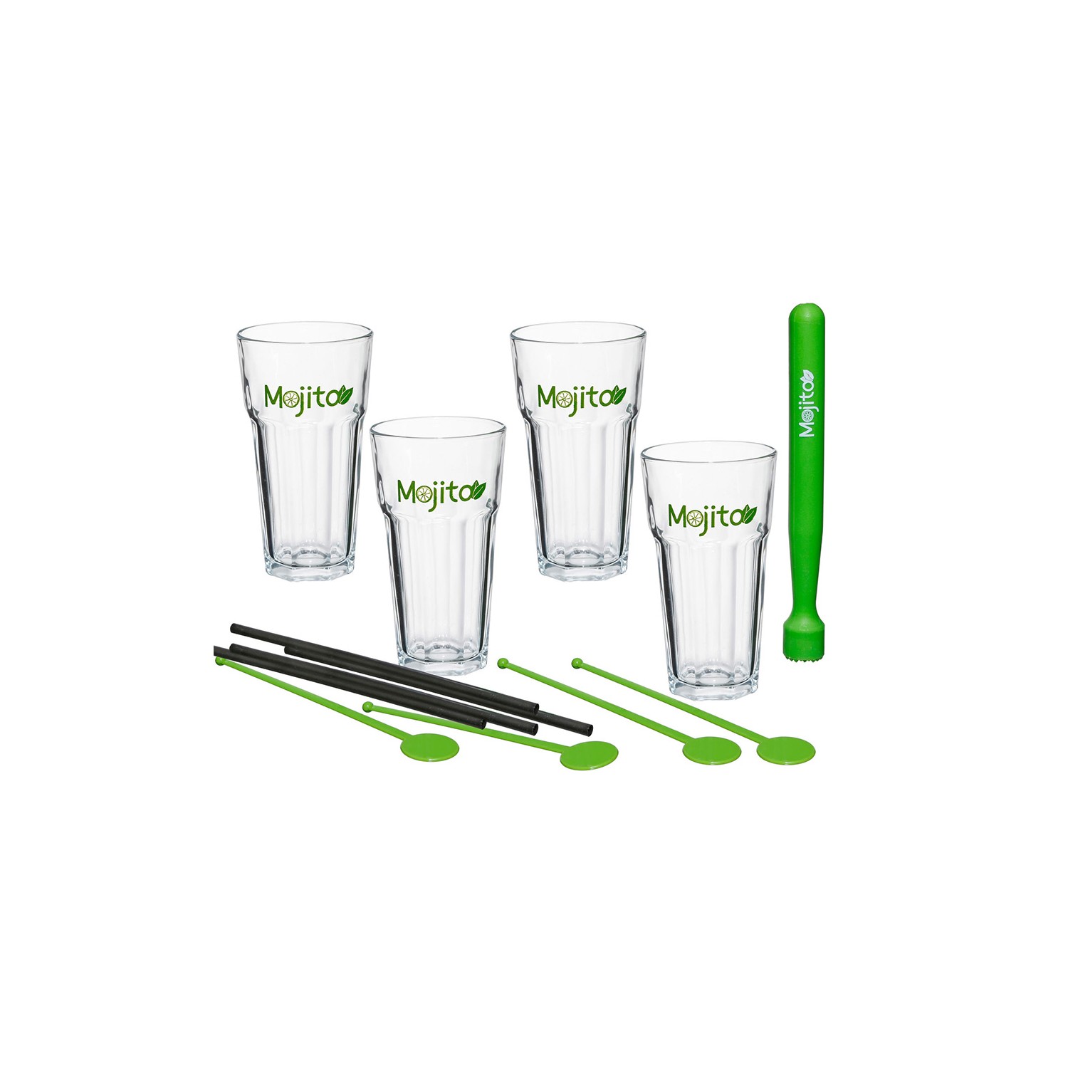 Kit para mojitos. kit con 13 piezas: 4 vasos grandes, 4 pajitas color negro, 4 mezcladores color verde, 1 mortero color verde