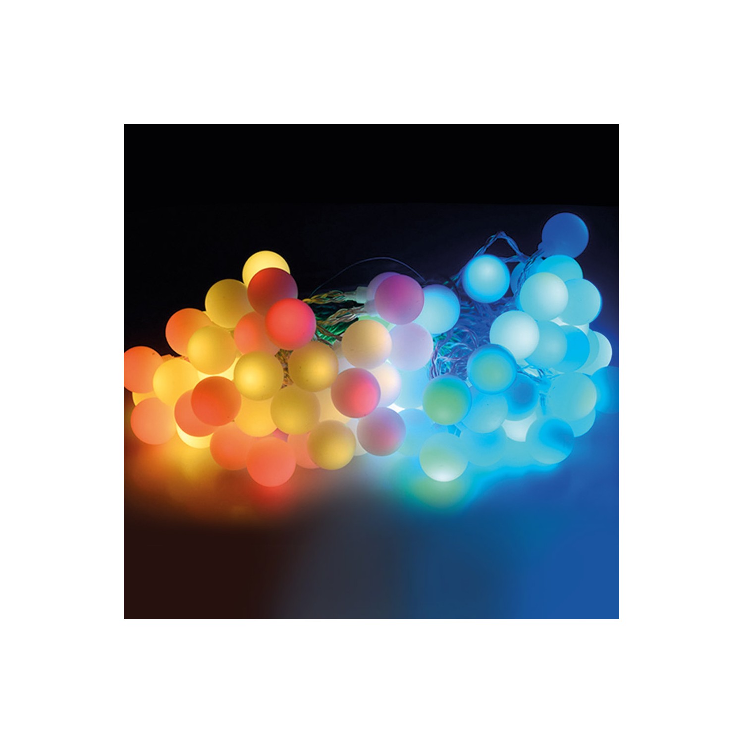 Guirnalda 80 leds, multicolor colores vivos, exterior ip44, 220 - 240 v 50/60 hz, cable de alimentación 3 m, espacio entre bombillas 20 cm, bolas ø25 mm, distancia entre la primera bombilla y la última 16 m, largo total 19 m
