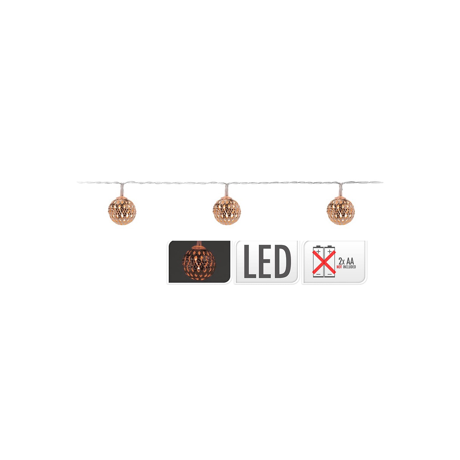 Guirnalda a pilas fija 10 leds con bolas color cobre 2,5cm luz blanco calido pilas 2xaa no incluidas ip20 cable transparente 10cm entre bombillas leds 5mm cable alimentación 30cm. distancia entre la primera bombilla y la ultima 1m. largo total: 1,3m