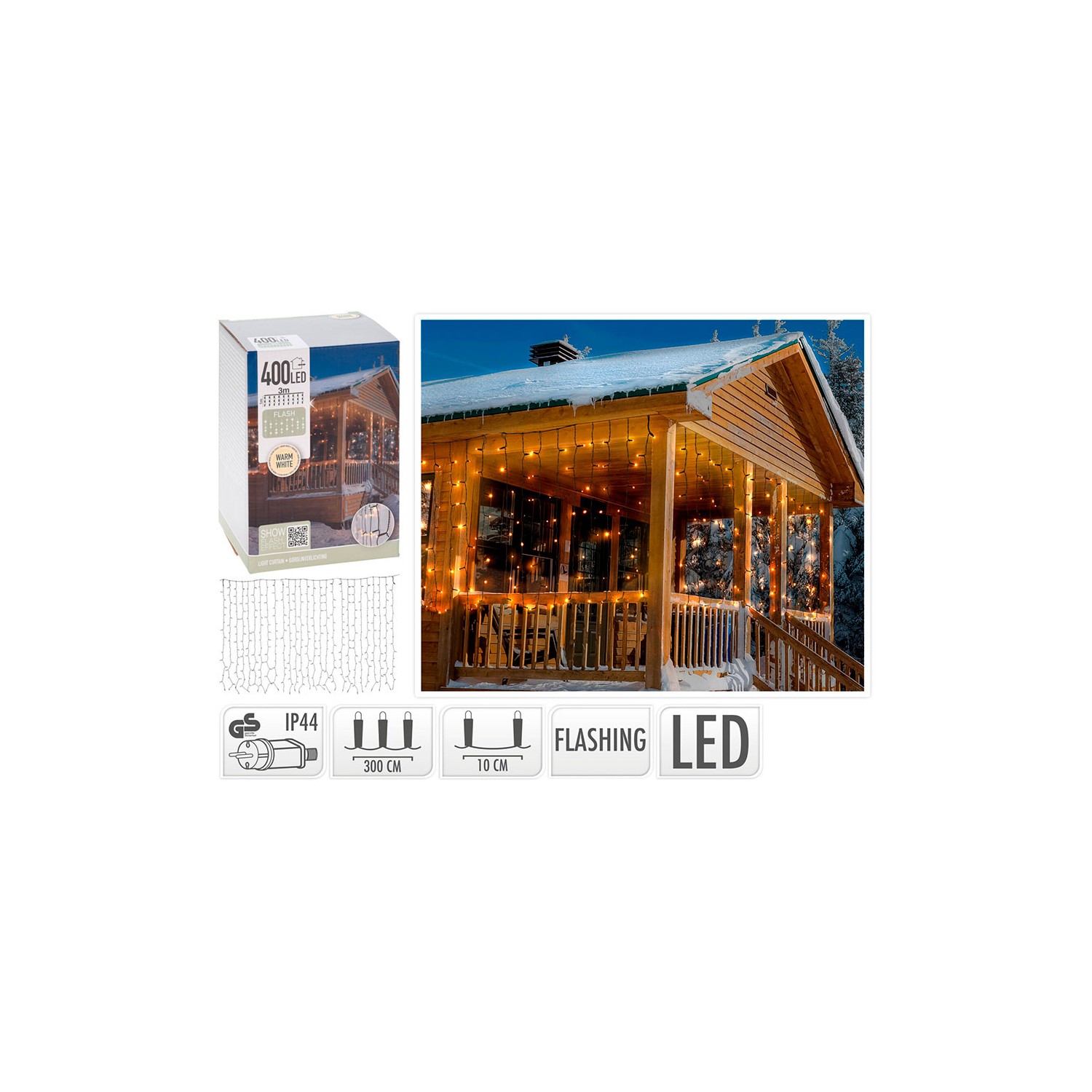 Cortina 400 leds flash blanco cálido 3x1m. (ancho/alto) 400 bombillas intermitentes, distancia de cadena: 77mm, distancia de las bombillas en hilo: 10cm, 40 hilos en total, por hilo: 10 leds, hilo negro 5m, adaptador ip44