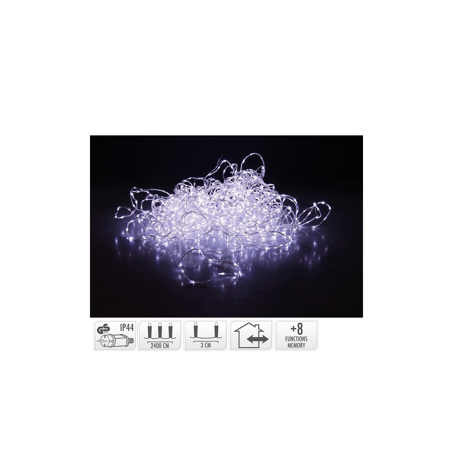 Guirnalda soft wire 800 leds blanco frio 8 funciones. hilo transparente, distancia bombilla: 3cm, hilo de plomo: 3m, sección transversal: 0.15mm², adaptador 31v/3.6w, controlador de 8 funciones con memoria. cable alimentacion 3m. distancia entre la primera bombilla y la ultima 24m. largo total: 27m.