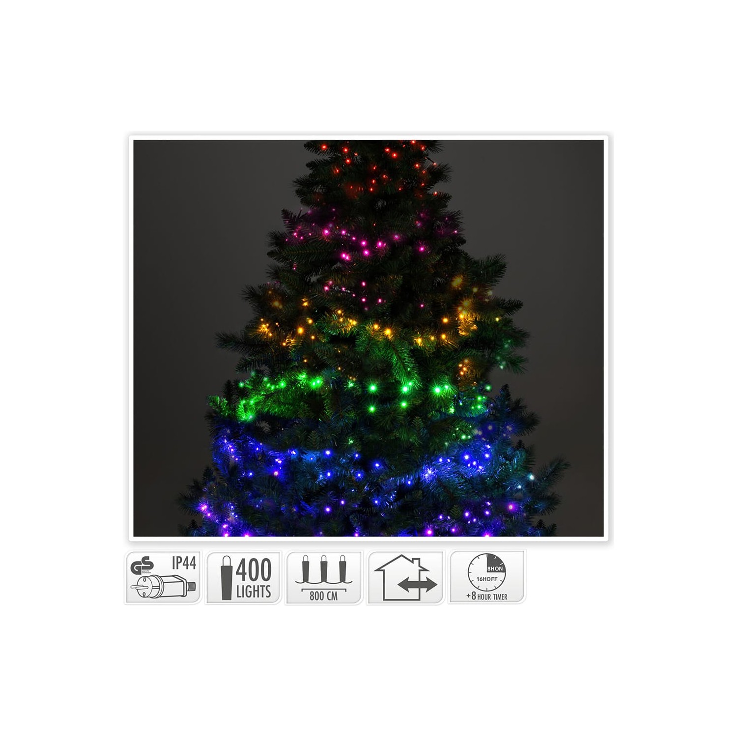 Guirnalda led, 7 secciones de color, para interior y exterior, 400 leds, 220v, distancia entre primer y ultimo led 8m, temporizador 8h. cable 350cm