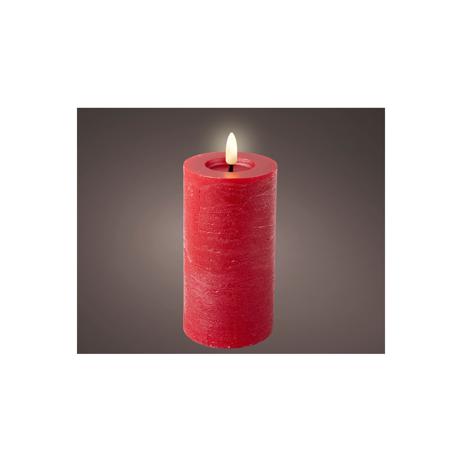 Vela de cera led, efecto llama, color rojo, superficie rústica, medidas: ø7 x 15 cm. uso: interior. color led: luz cálida con temporizador 6 h encendida/18 h apagada autonomía: 250 h funciona con pilas 2 x aaa (no incluidas)
