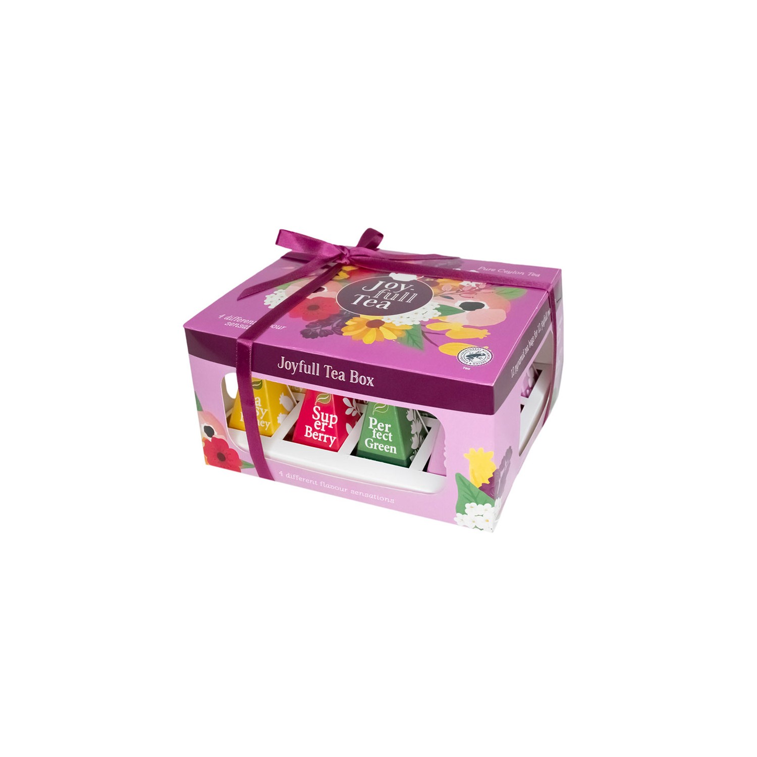 Caja de té joyfull pyramid tea con cuatro sabores diferentes: té verde, jazmin , mezcla de bayas y miel de jengibre, té fruta de la pasión. peso de cada bolsa 6 gramos