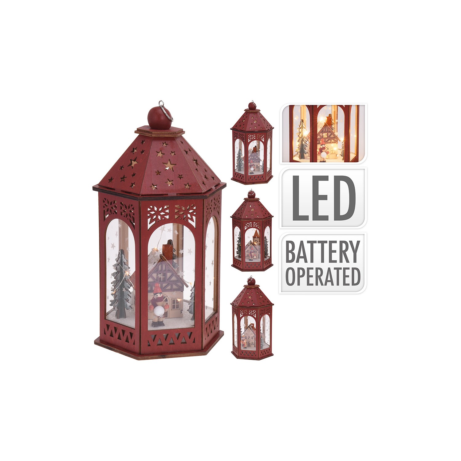 Farolillo led de madera con escena navideña medidas: 16x14x29cm (ancho/fondo/alto). rojo con 10 luces led calidas 2 x aa no incluidas. modelos variados