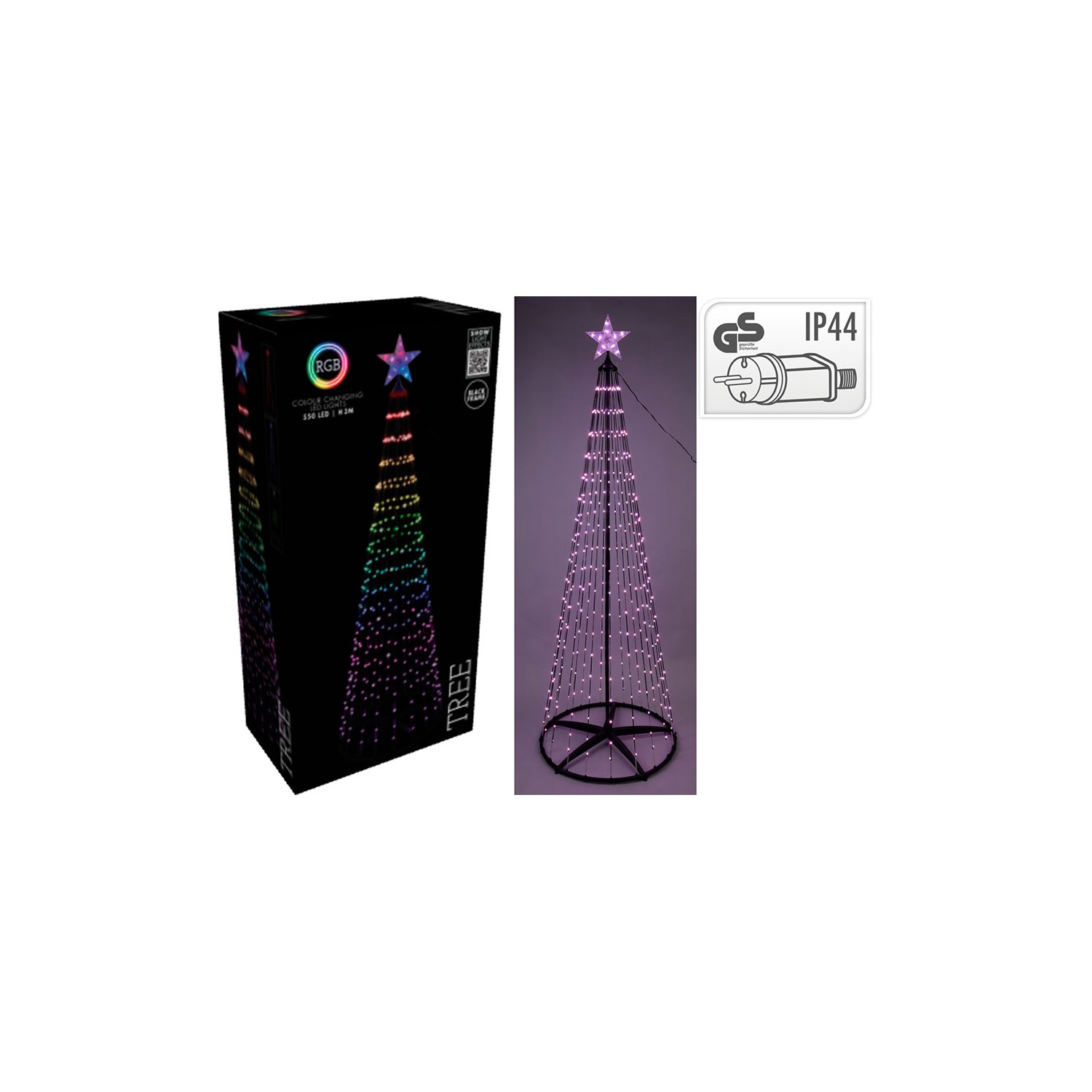 Arbol de navidad con marco de color negro, 550 led rgb digitales, estrella superior con 10 led, consta de 20 cuerdas, cada una de 27 led. cable 800 cm, 4 pcs pines de tierra, ip44. mando a distancia (incluido). dimensiones base ø90 cm / 275 x 170 x 520 mm / altura total 3 m